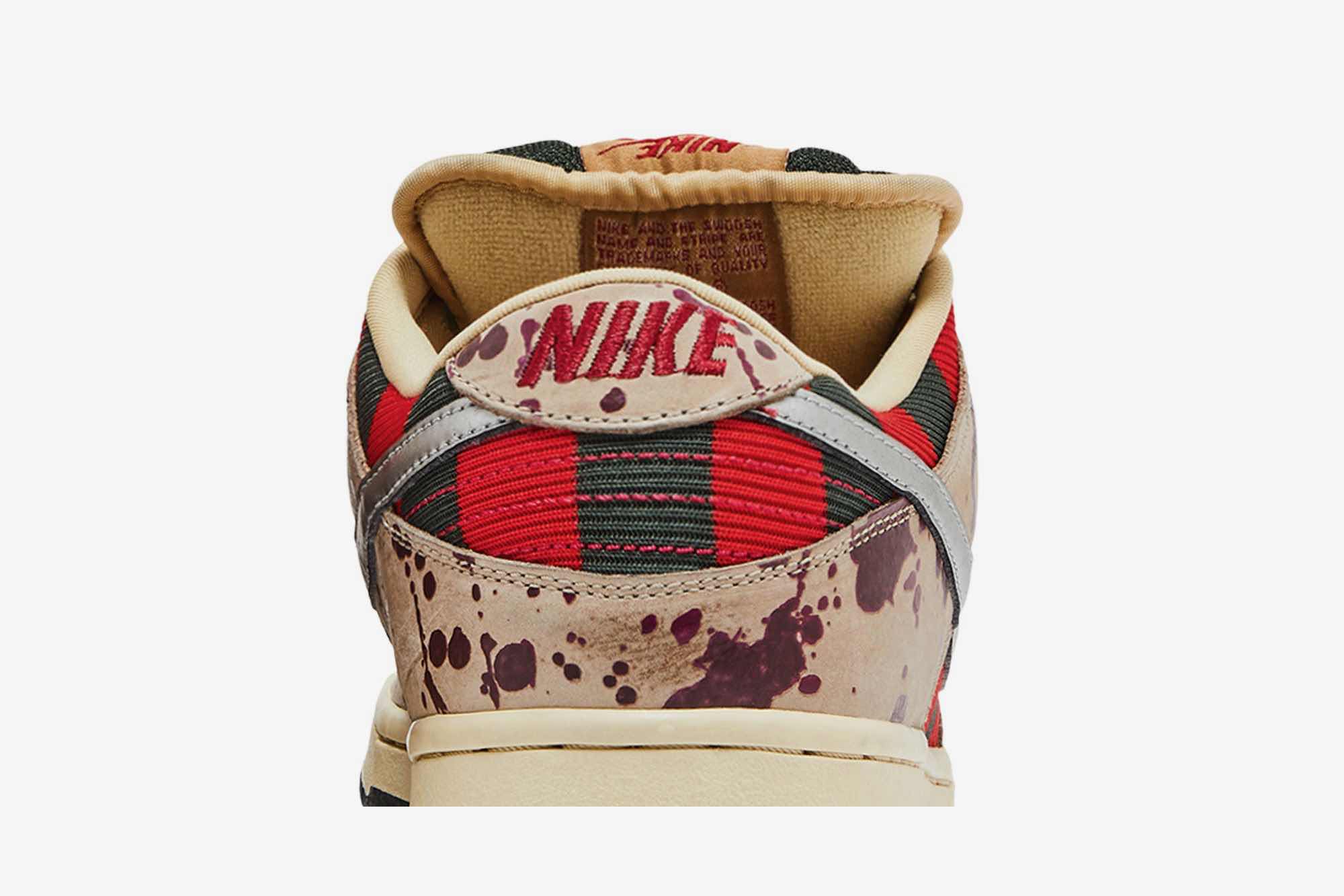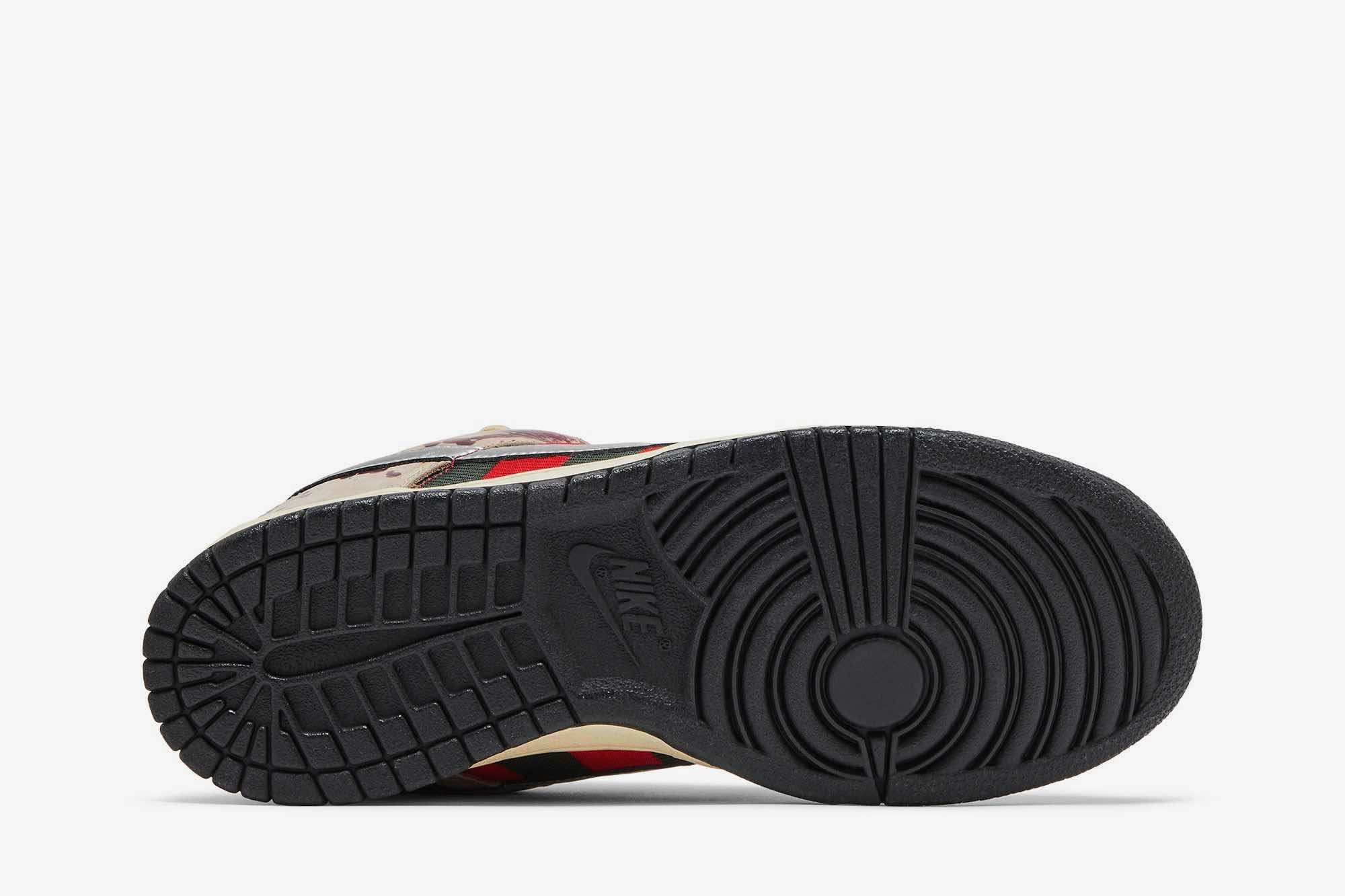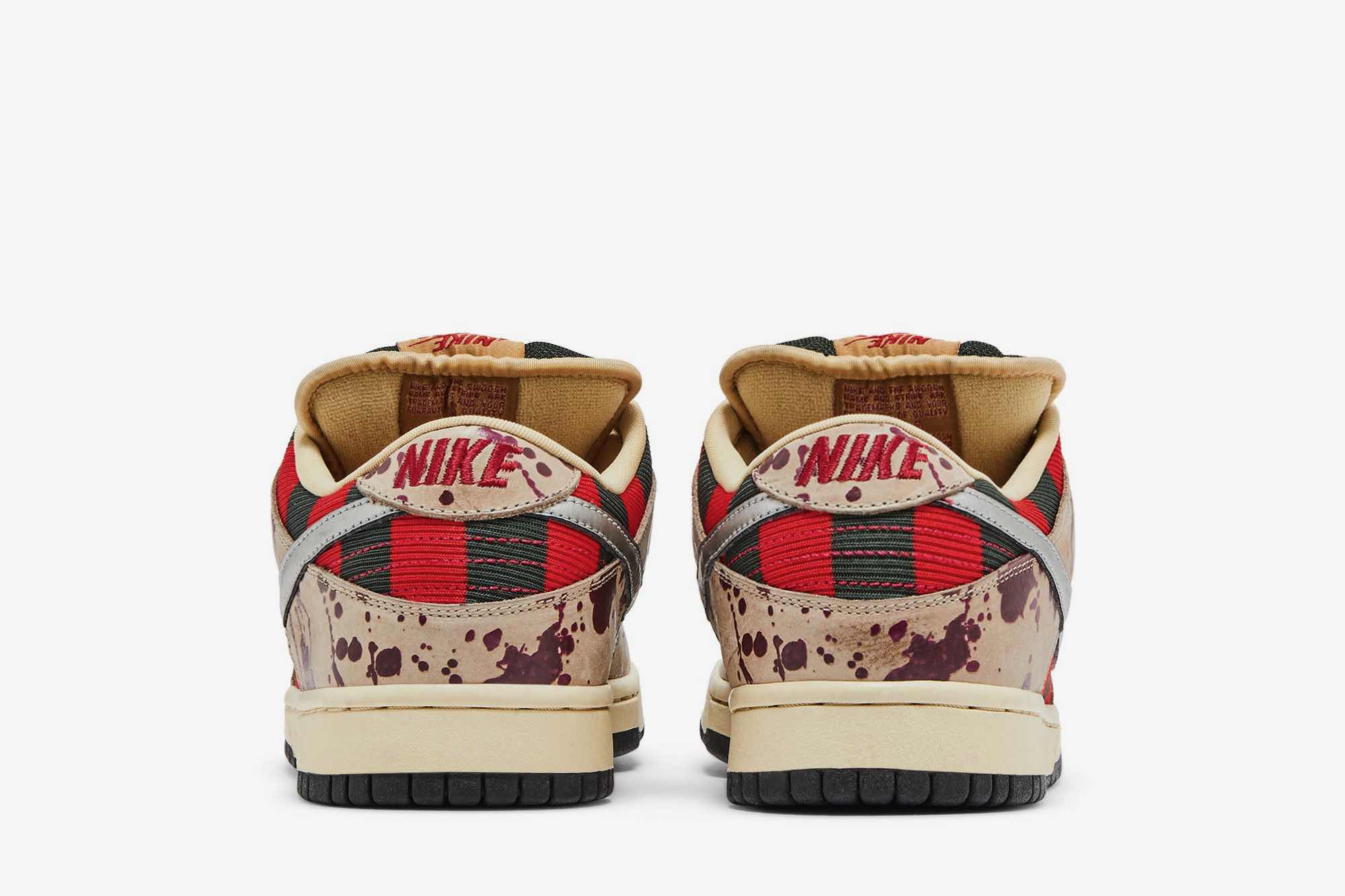 Introducing the Nike Dunk Low Pro SB Skateboard ‘Freddy Krueger’ – a sneaker that pays tribute to one of the most iconic horror movie villains of all time. This limited edition shoe is sure to be a collectors item, with its two-tone textile base and bloody leather overlays designed to replicate Freddy’s signature sweater from the Nightmare on Elm Street films. A metallic silver Swoosh adds a touch of luxury, while also paying homage to the deadly razor blades that extend from Freddy’s glove. If you’re a fan of horror movies or simply looking for a unique and eye-catching sneaker, then this is the perfect shoe for you.