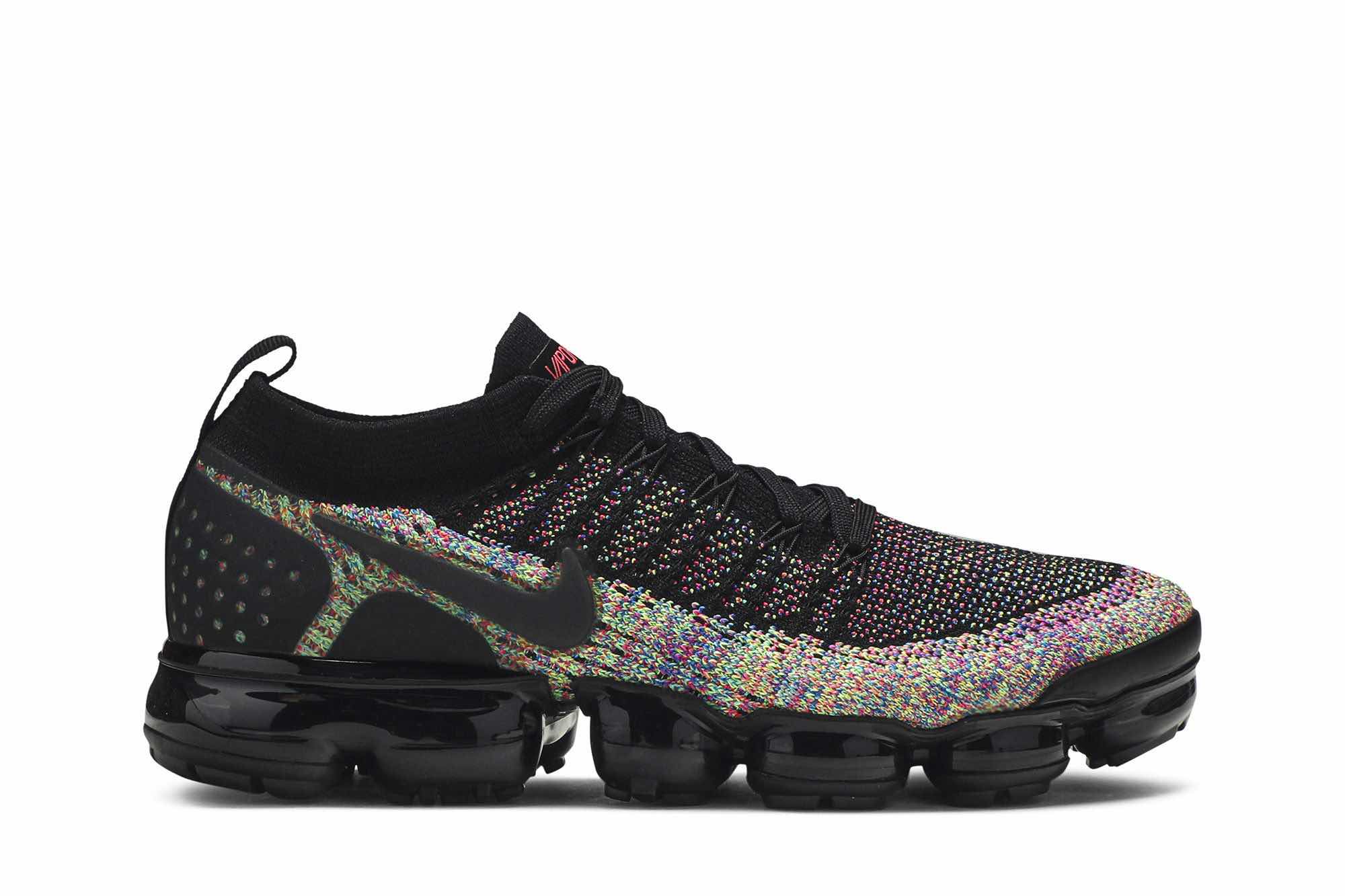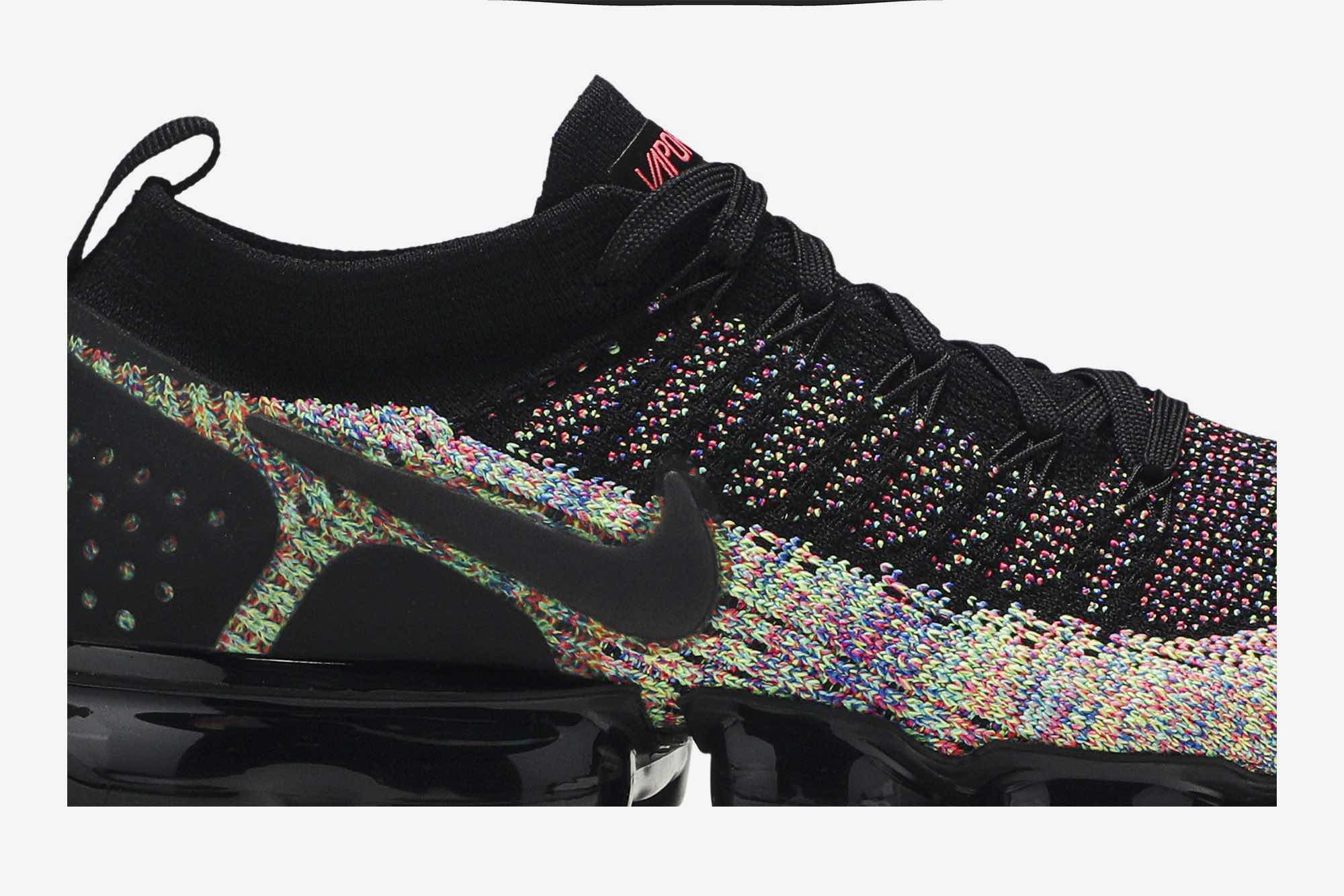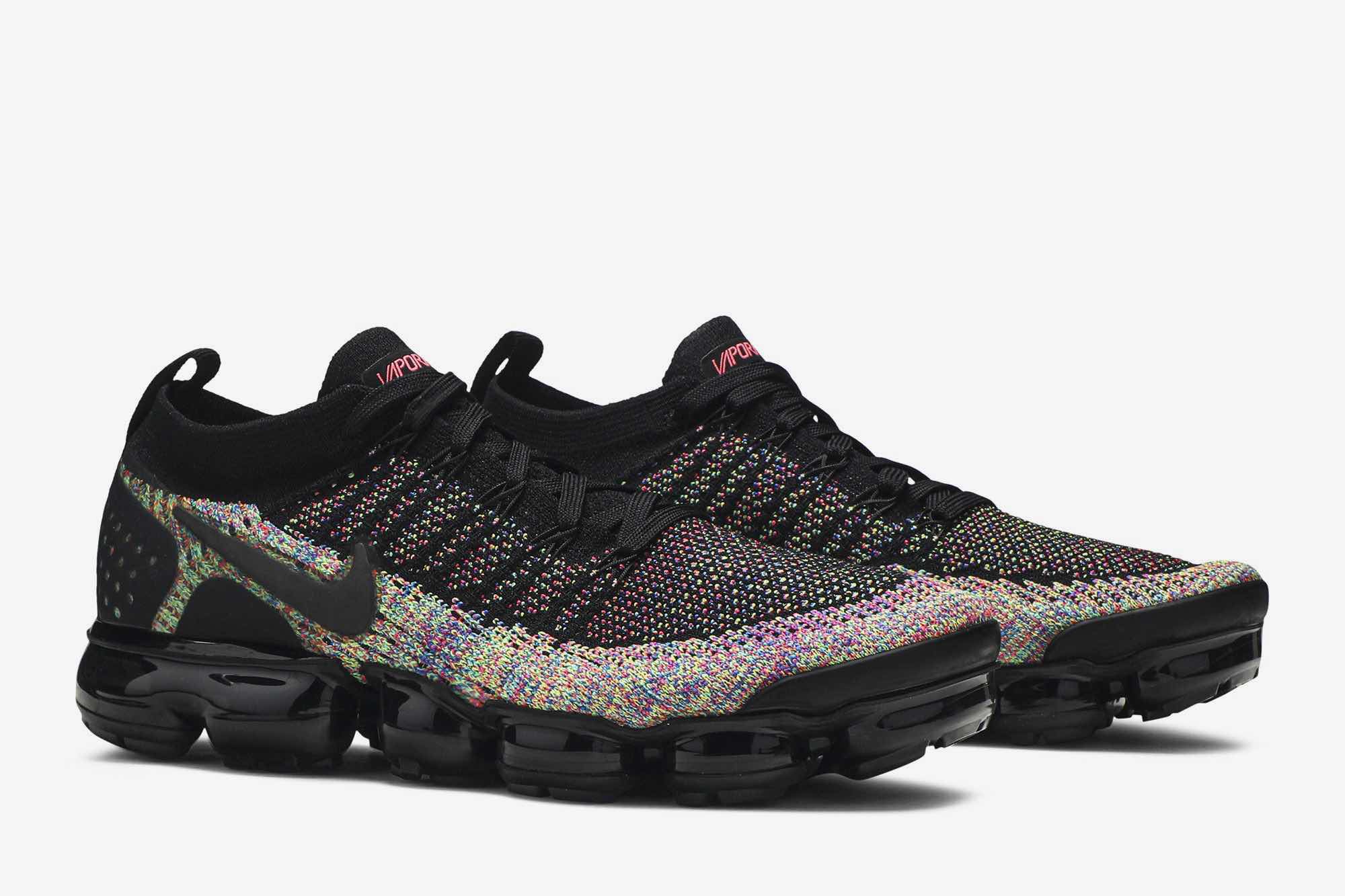 The Air VaporMax Flyknit 2 ‘Black Multi-Color’ features a black-based Flyknit upper overlaid with multicolor knit detailing throughout. The sneaker prominently sports black Flywire technology along the side for lockdown, a sock-like collar for a snug fit, synthetic reinforcements on the heel, and a VaporMax sole unit.