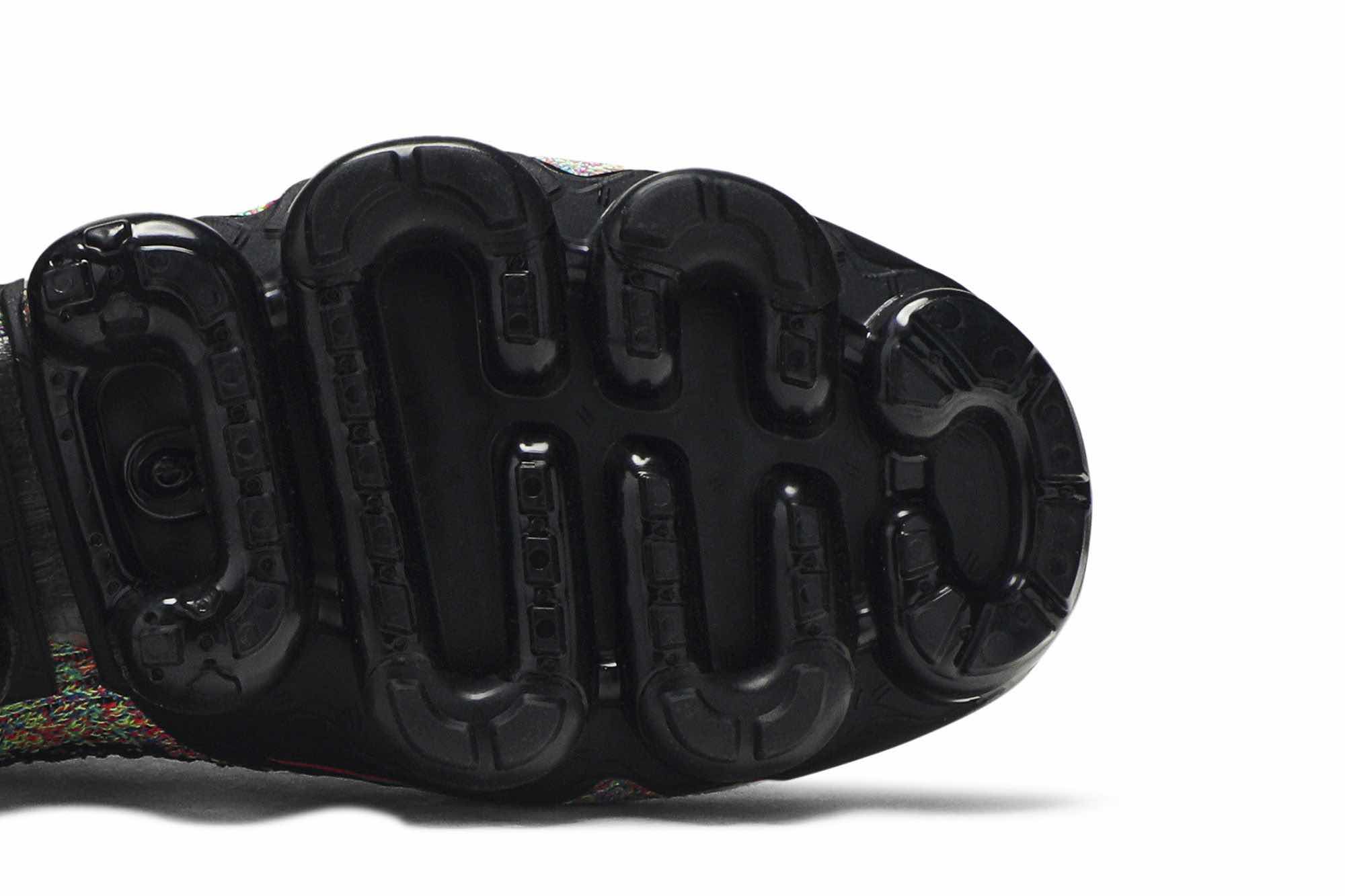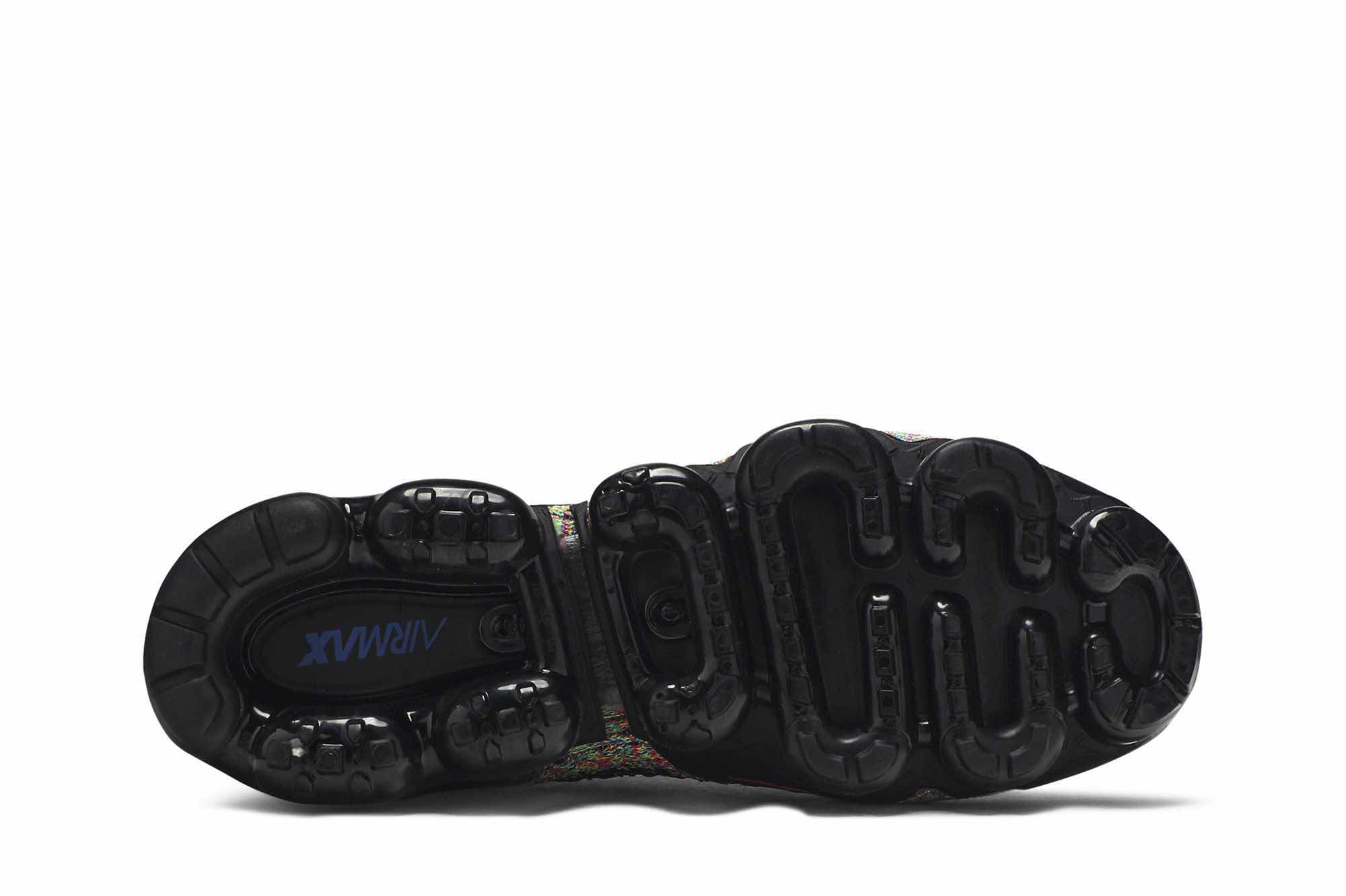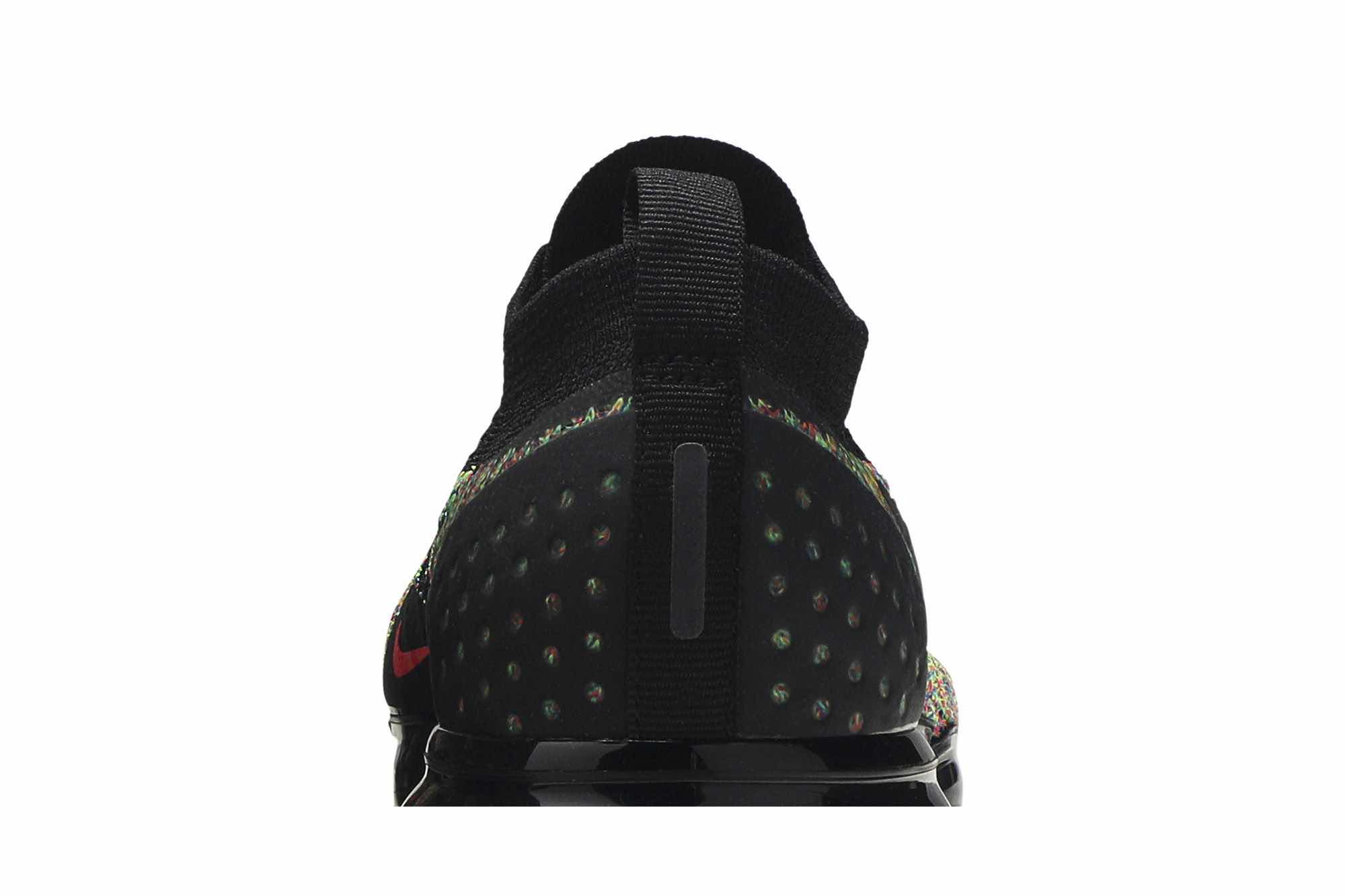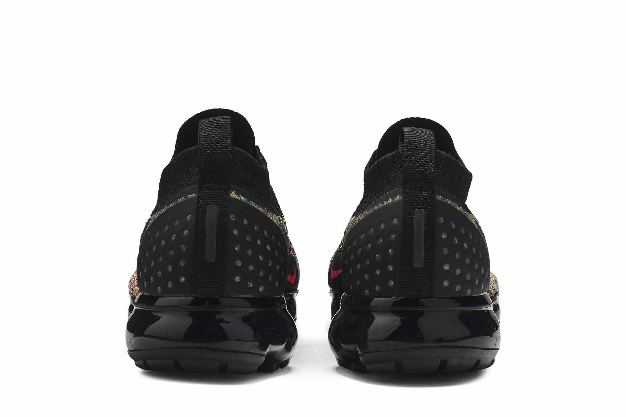 The Air VaporMax Flyknit 2 ‘Black Multi-Color’ features a black-based Flyknit upper overlaid with multicolor knit detailing throughout. The sneaker prominently sports black Flywire technology along the side for lockdown, a sock-like collar for a snug fit, synthetic reinforcements on the heel, and a VaporMax sole unit.