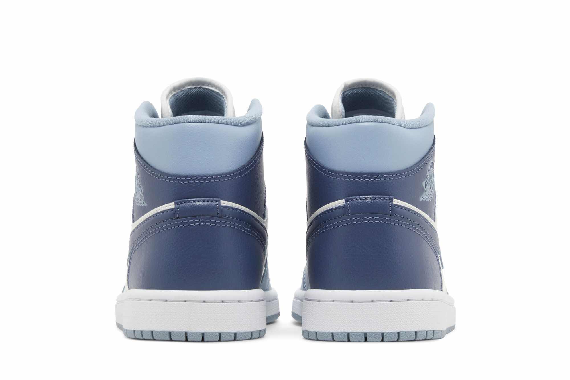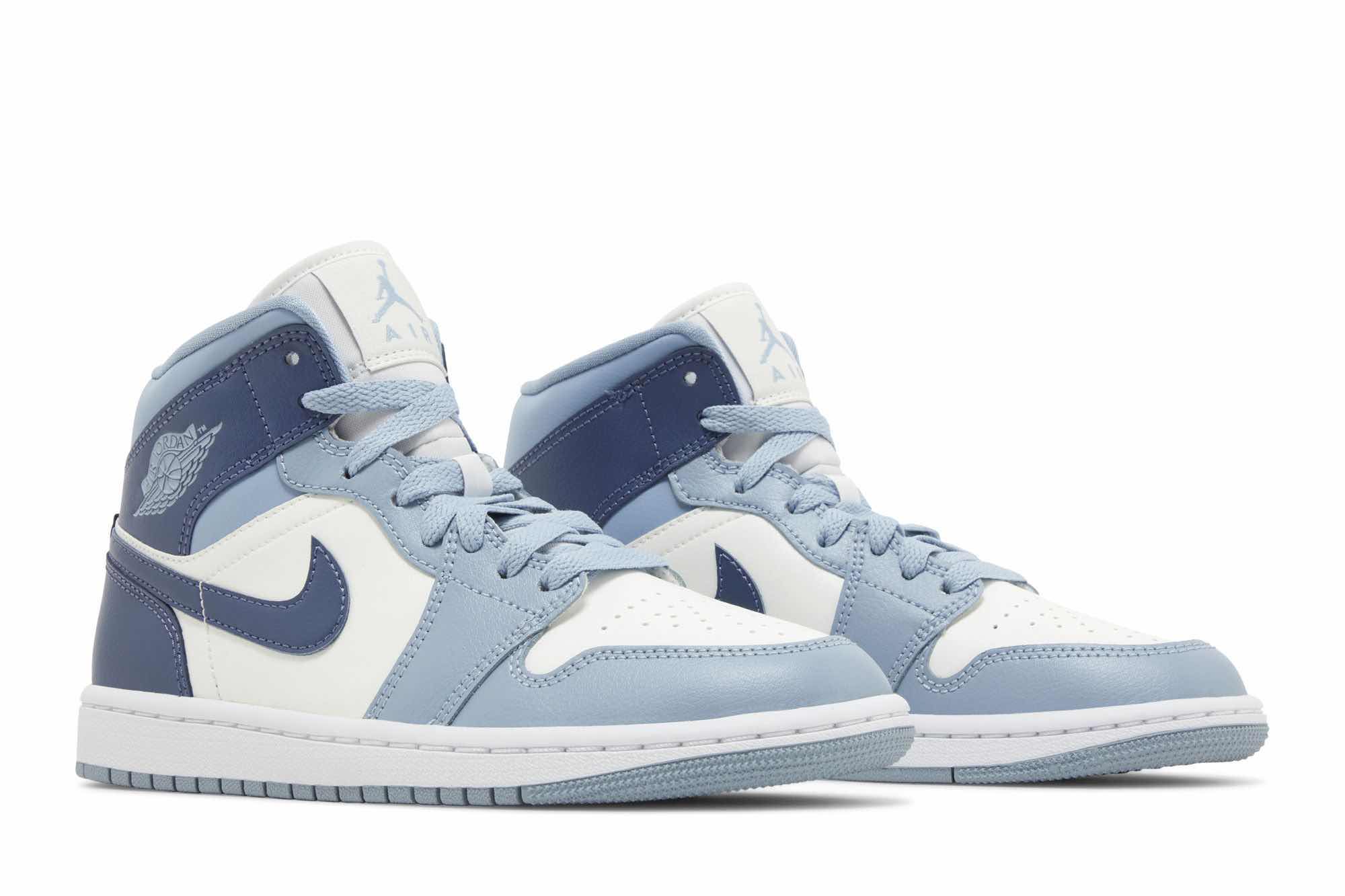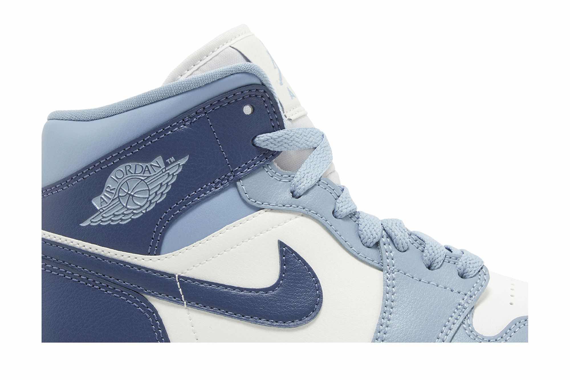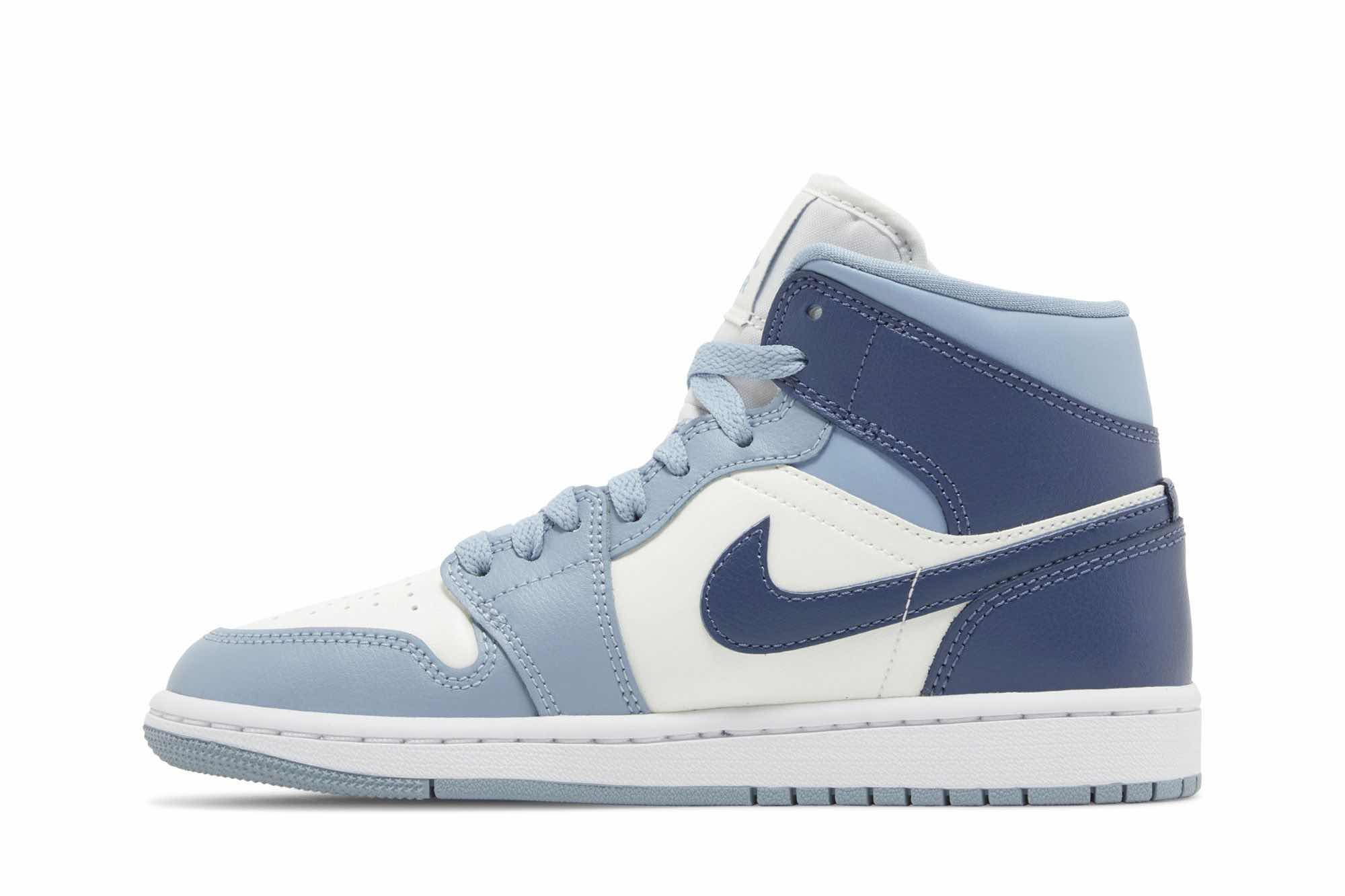 The Jordan 1 Mid Diffused Blue features a clean Sail leather upper with bold Diffused Blue accents on the Swoosh, heel, and overlays. The gray-blue hues on the laces, collar, and outsole add a subtle touch of contrast. This mid-top sneaker offers a comfortable fit with breathable perforations and a classic Air Jordan design.