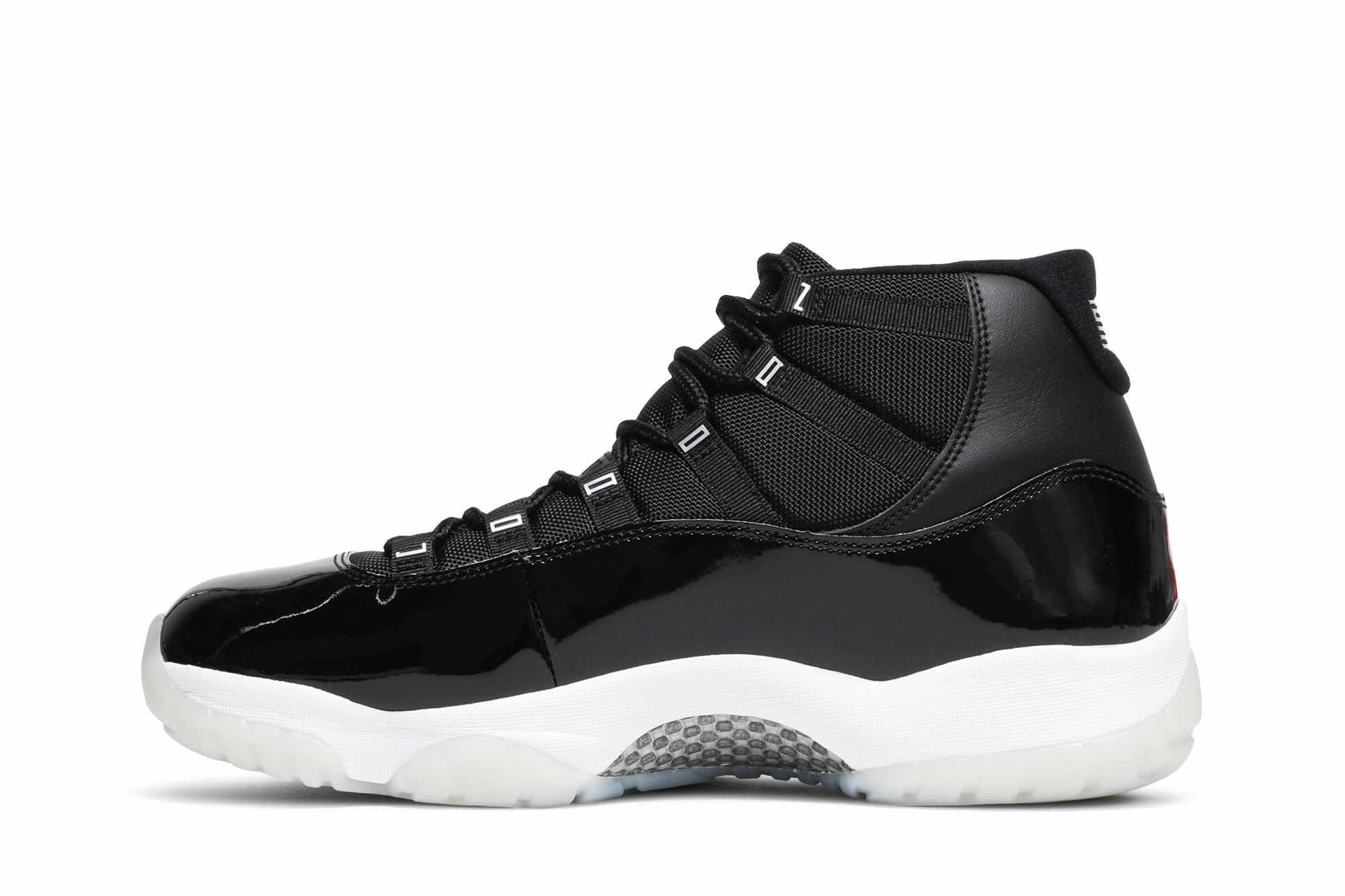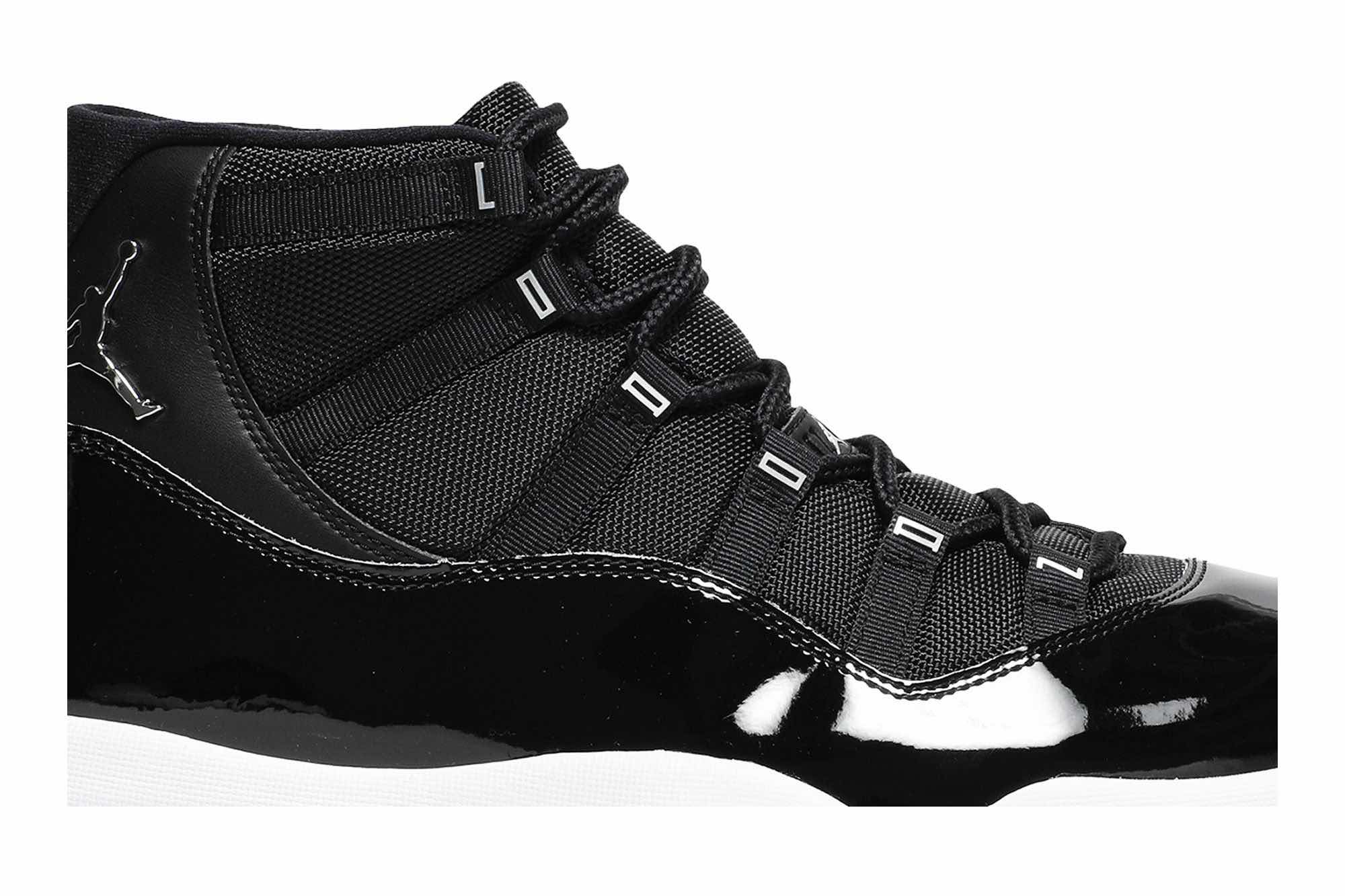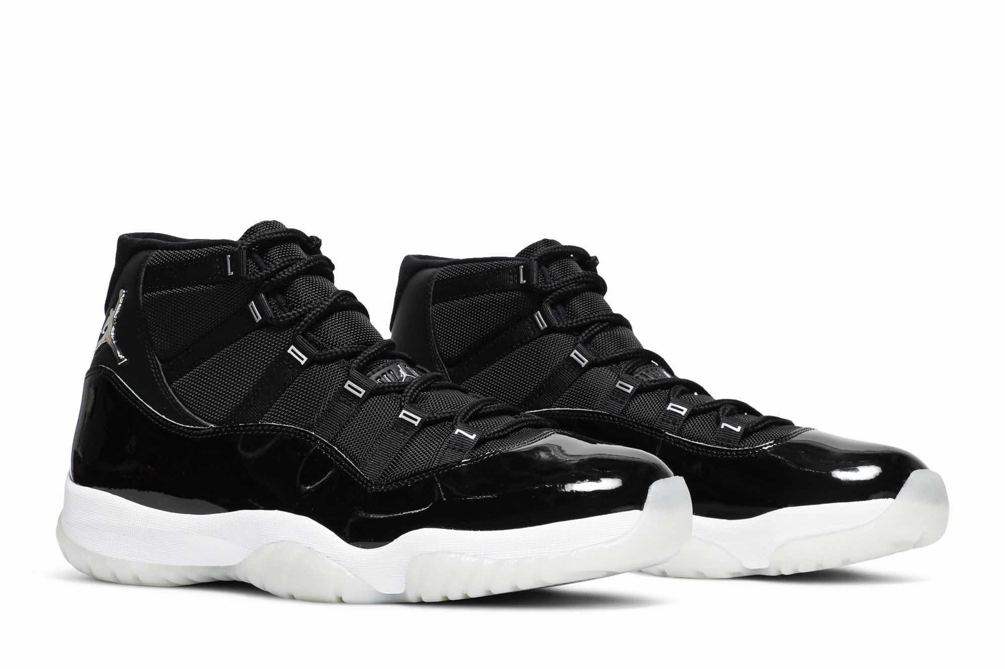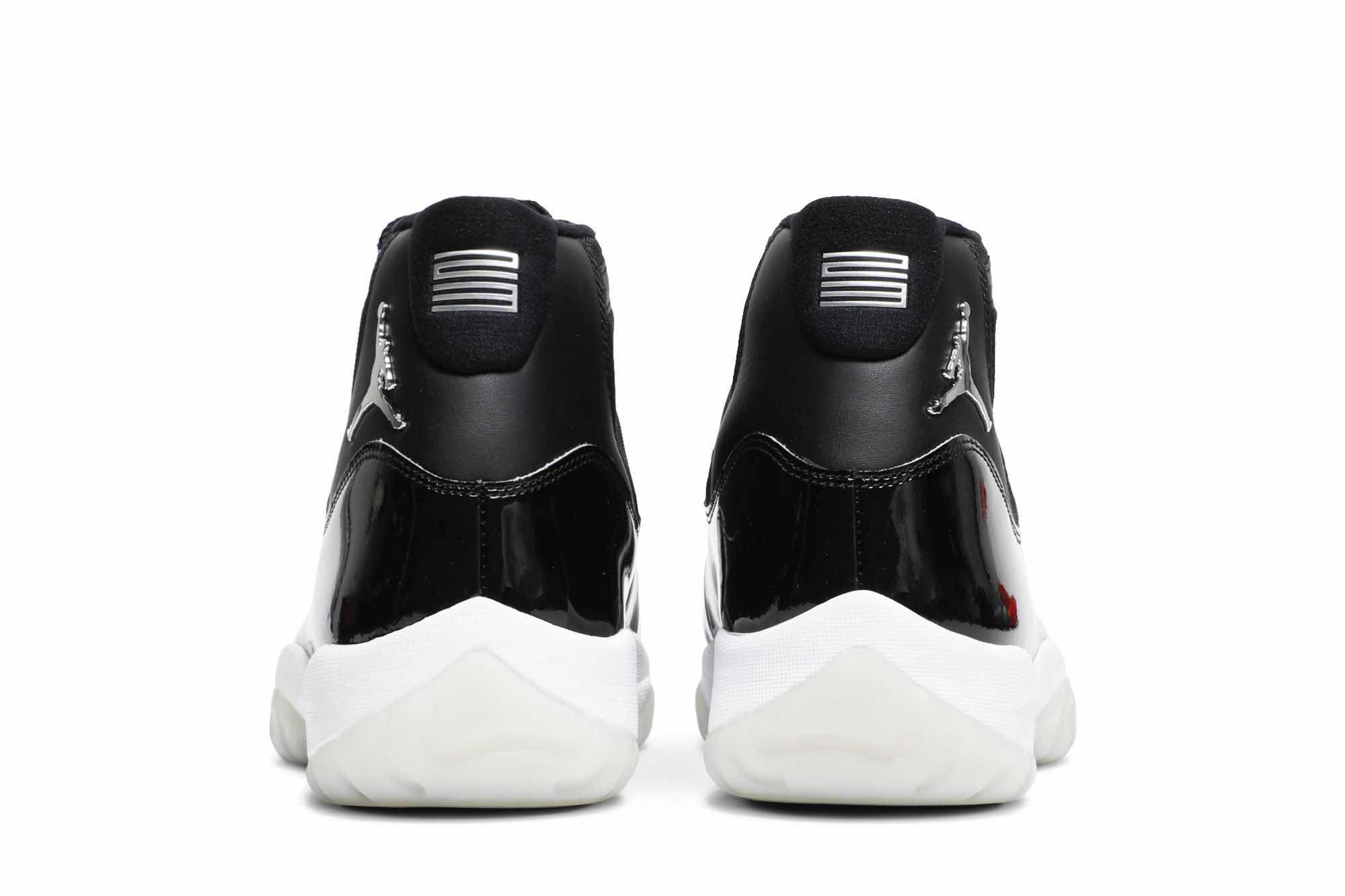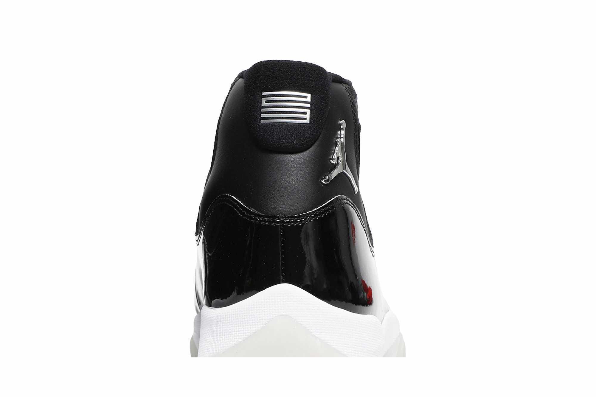 Nike Air Jordan 11 Retro “Jubilee 25th Anniversary ” dressed in Black, Sliver color scheme with a metallic silver Jumpman. The JORDAN on the eyelets and the classic glossy patent leather in piano black.
