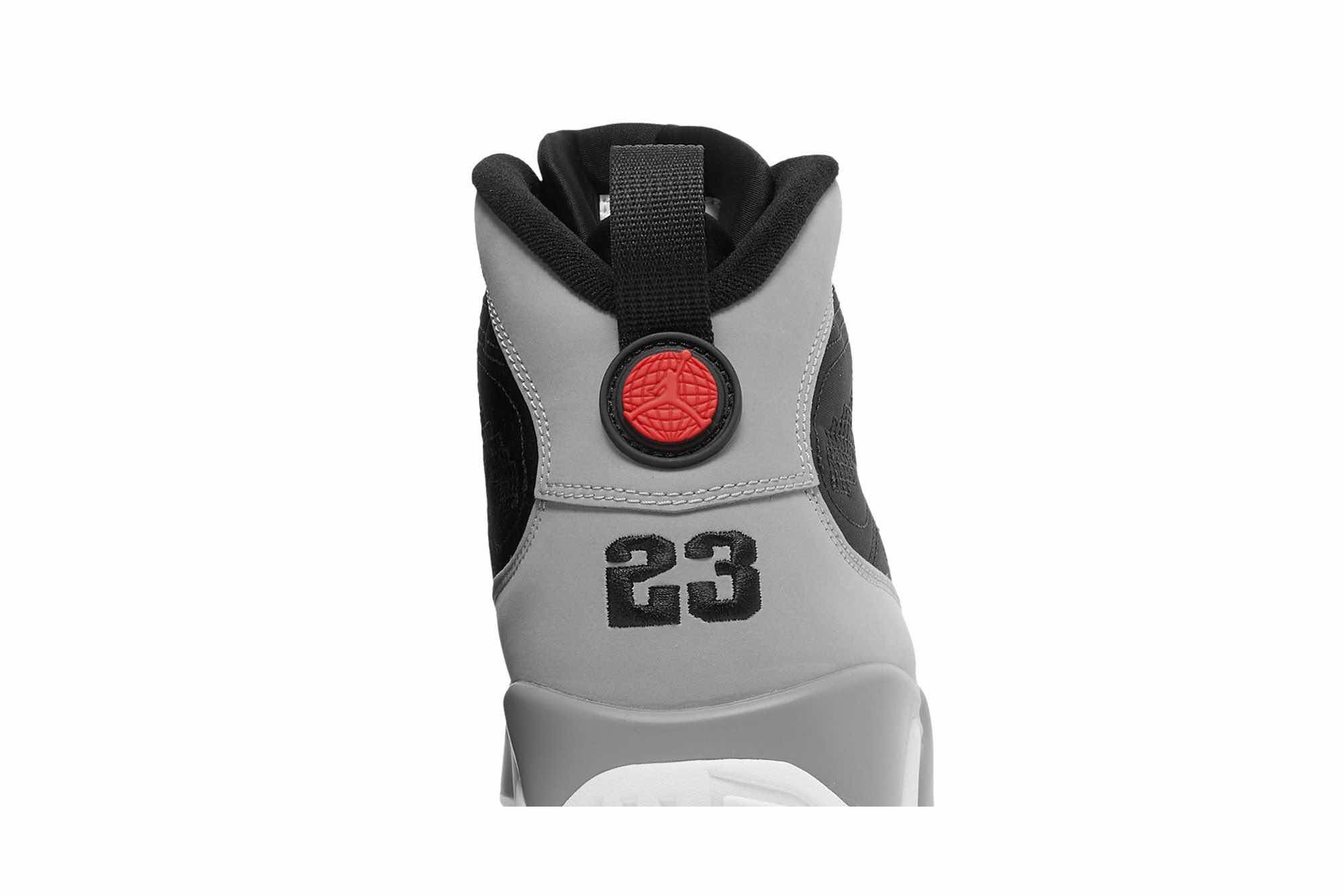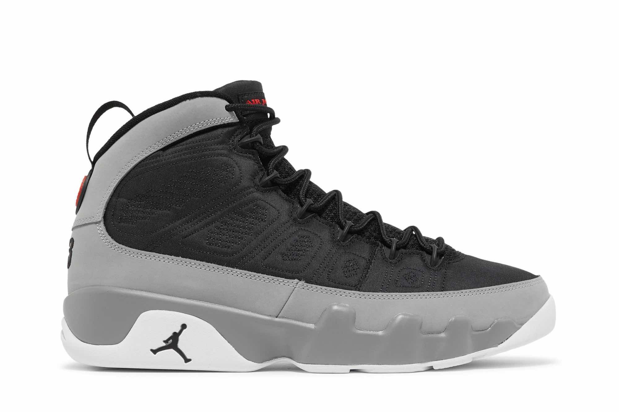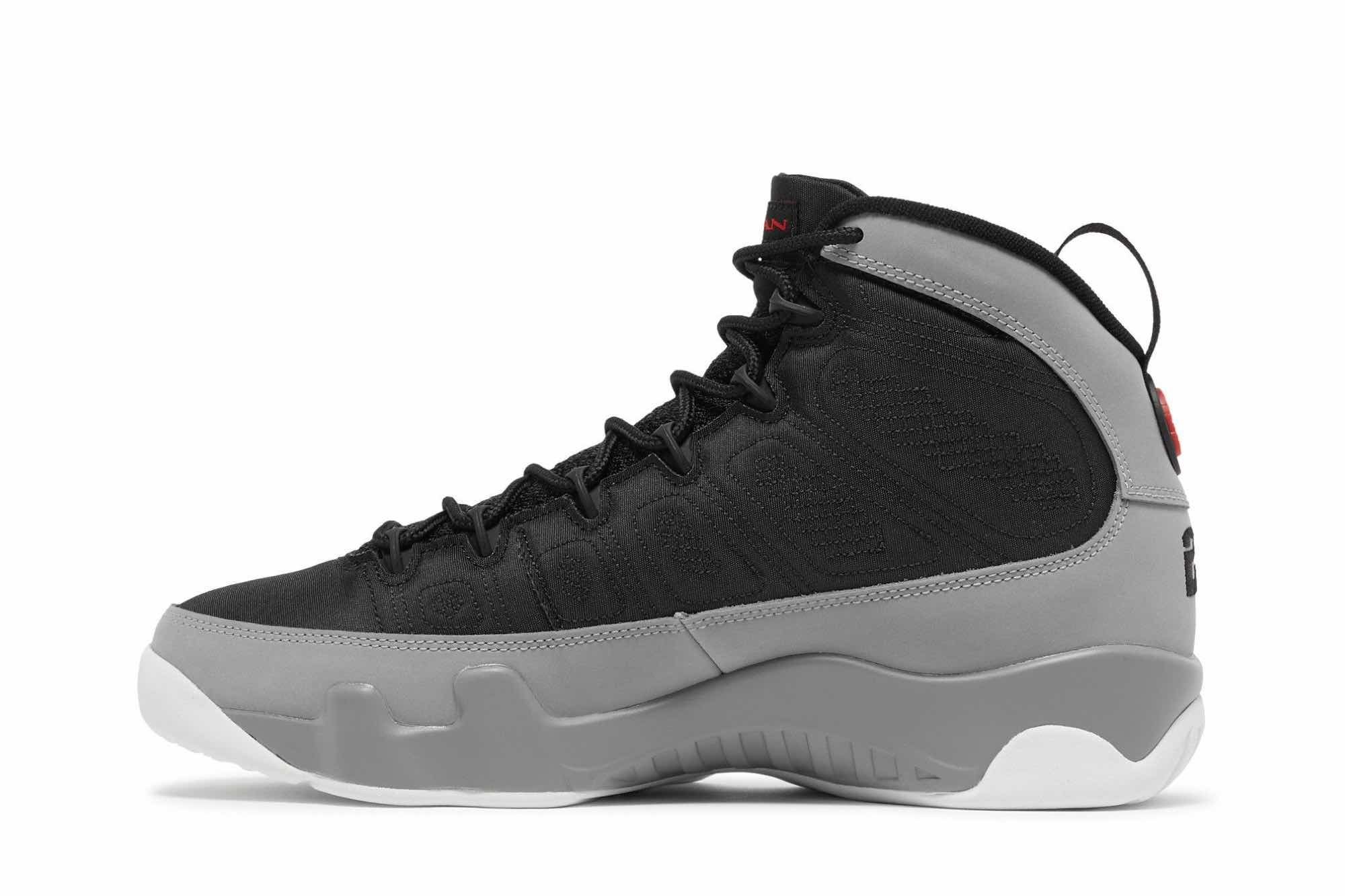 The Air Jordan 9 Particle Grey is a retro sneaker with a modern twist. This updated version of the ’90s classic features a breathable black textile upper, speed laces, and tonal stitch detailing. The nubuck mudguard in a neutral grey finish wraps around the heel and extends up the mid-cut collar. Contrasting hits of crimson land on the sneaker’s branding elements, including an Air Jordan tongue tag and a molded Jumpman emblem at the heel. Whether you’re hitting the court or just hitting the streets, this sneaker is sure to turn heads.