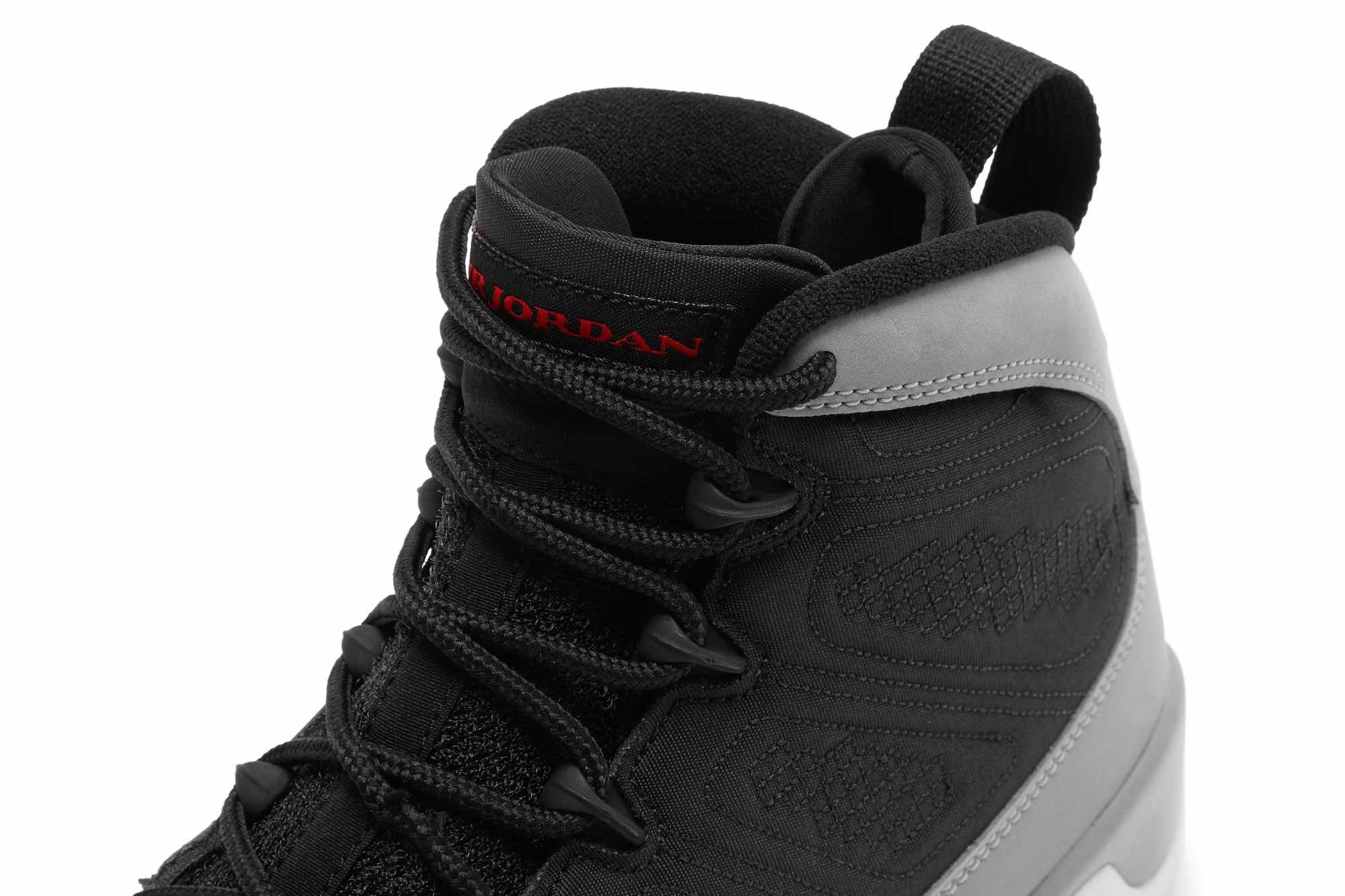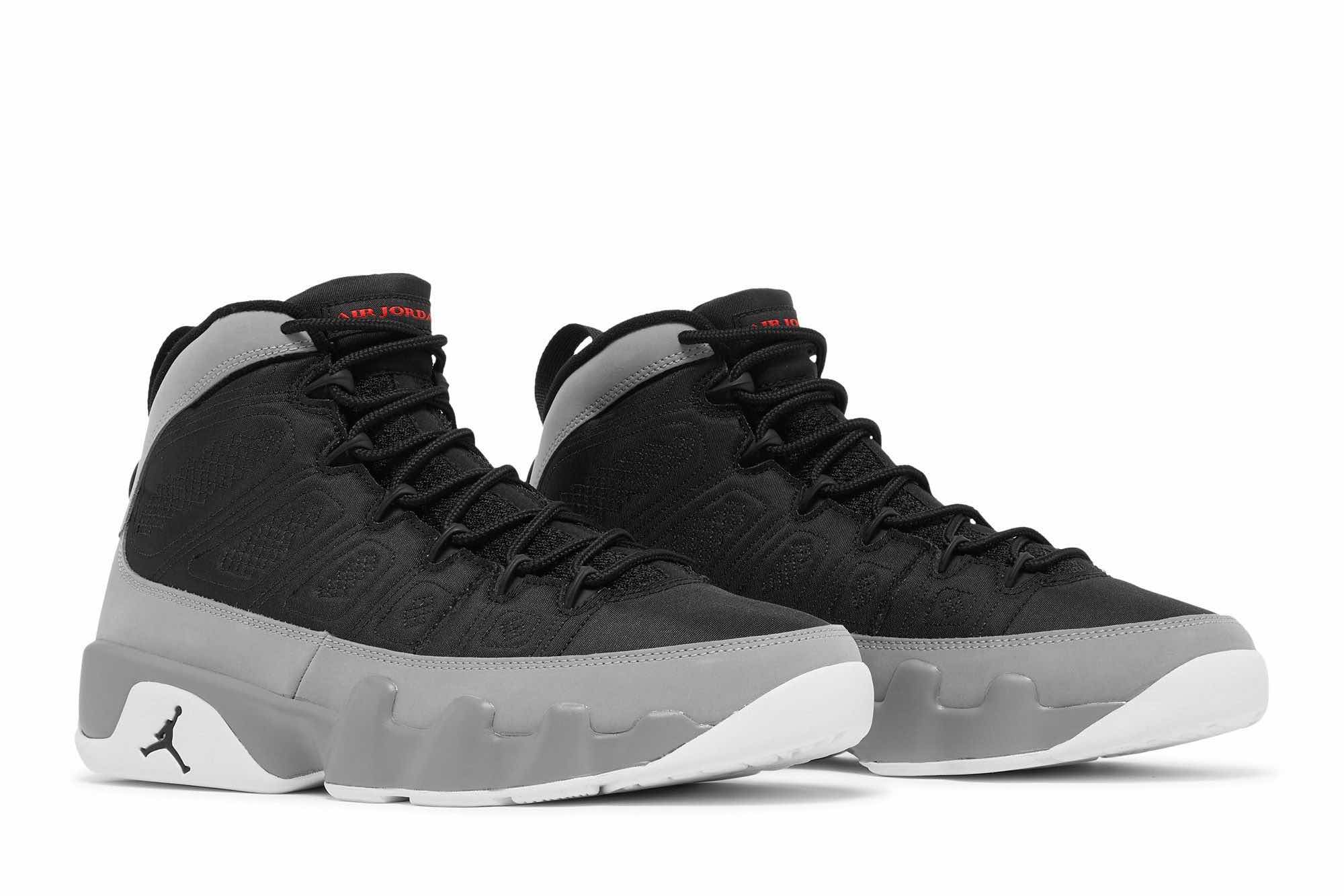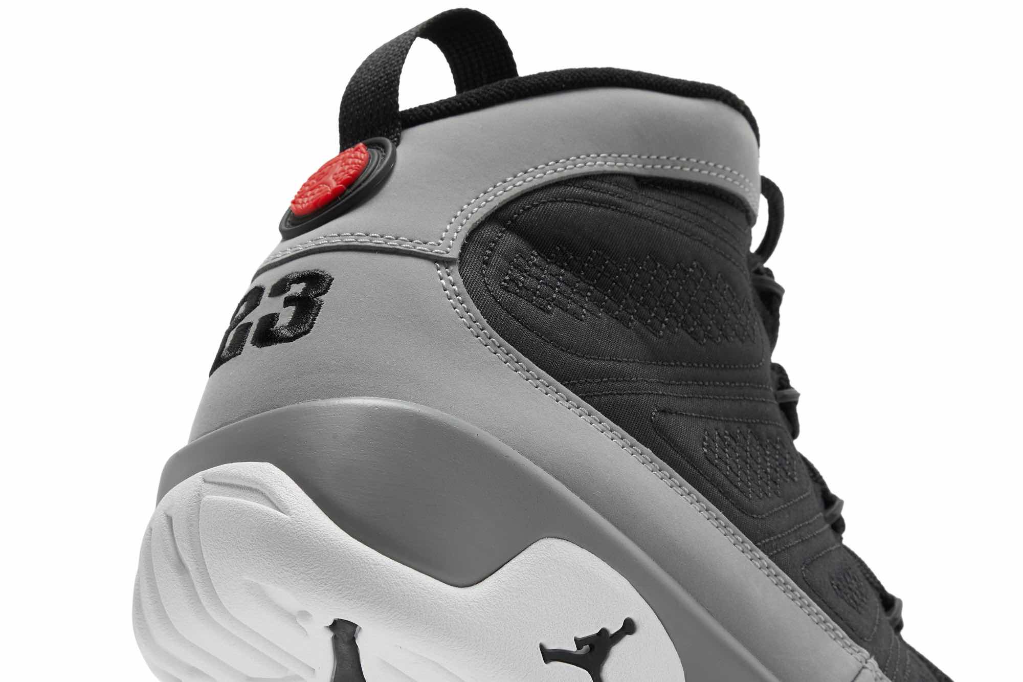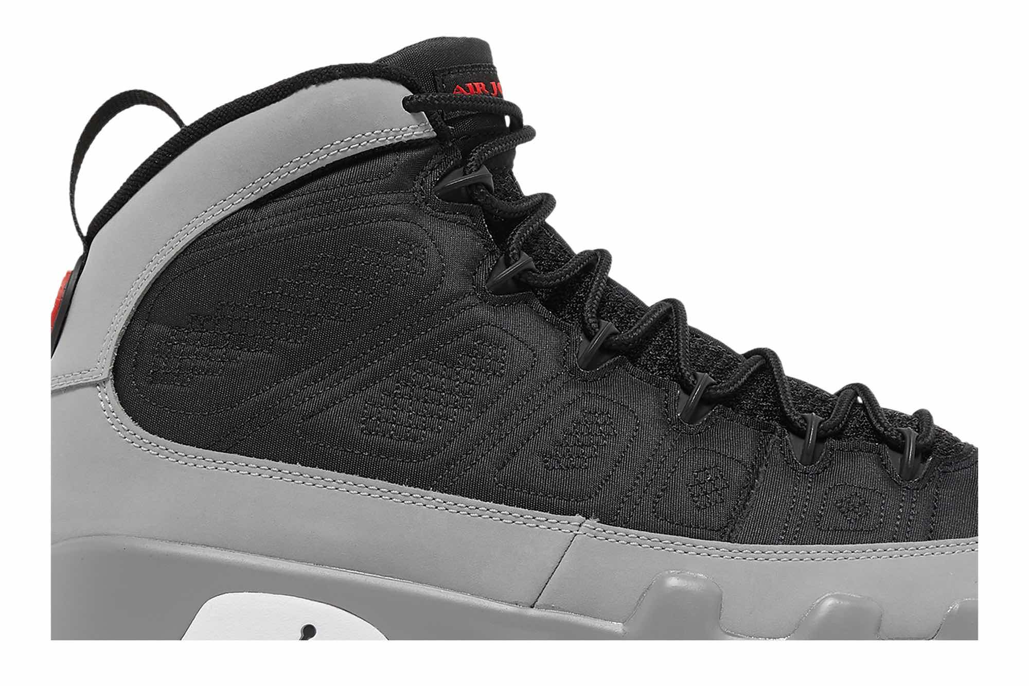 The Air Jordan 9 Particle Grey is a retro sneaker with a modern twist. This updated version of the ’90s classic features a breathable black textile upper, speed laces, and tonal stitch detailing. The nubuck mudguard in a neutral grey finish wraps around the heel and extends up the mid-cut collar. Contrasting hits of crimson land on the sneaker’s branding elements, including an Air Jordan tongue tag and a molded Jumpman emblem at the heel. Whether you’re hitting the court or just hitting the streets, this sneaker is sure to turn heads.