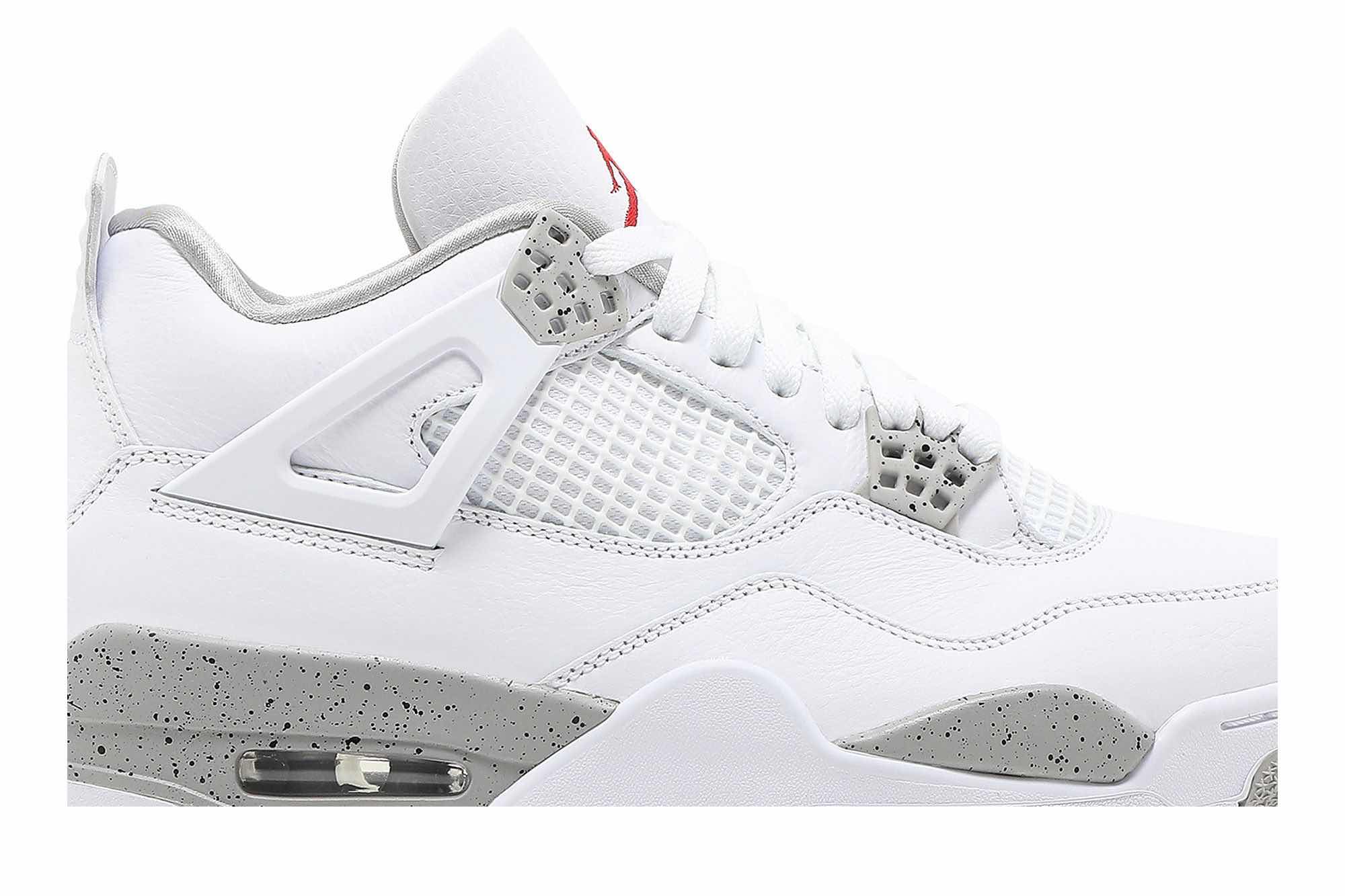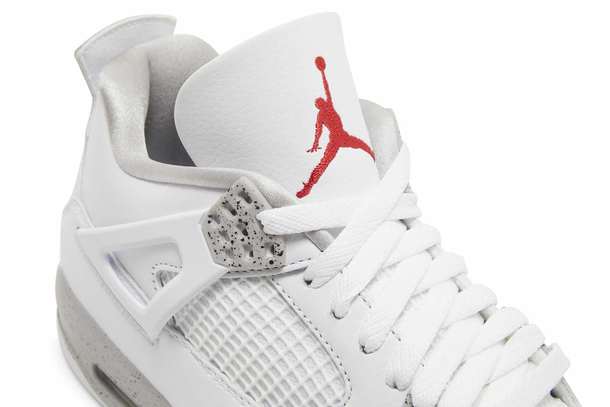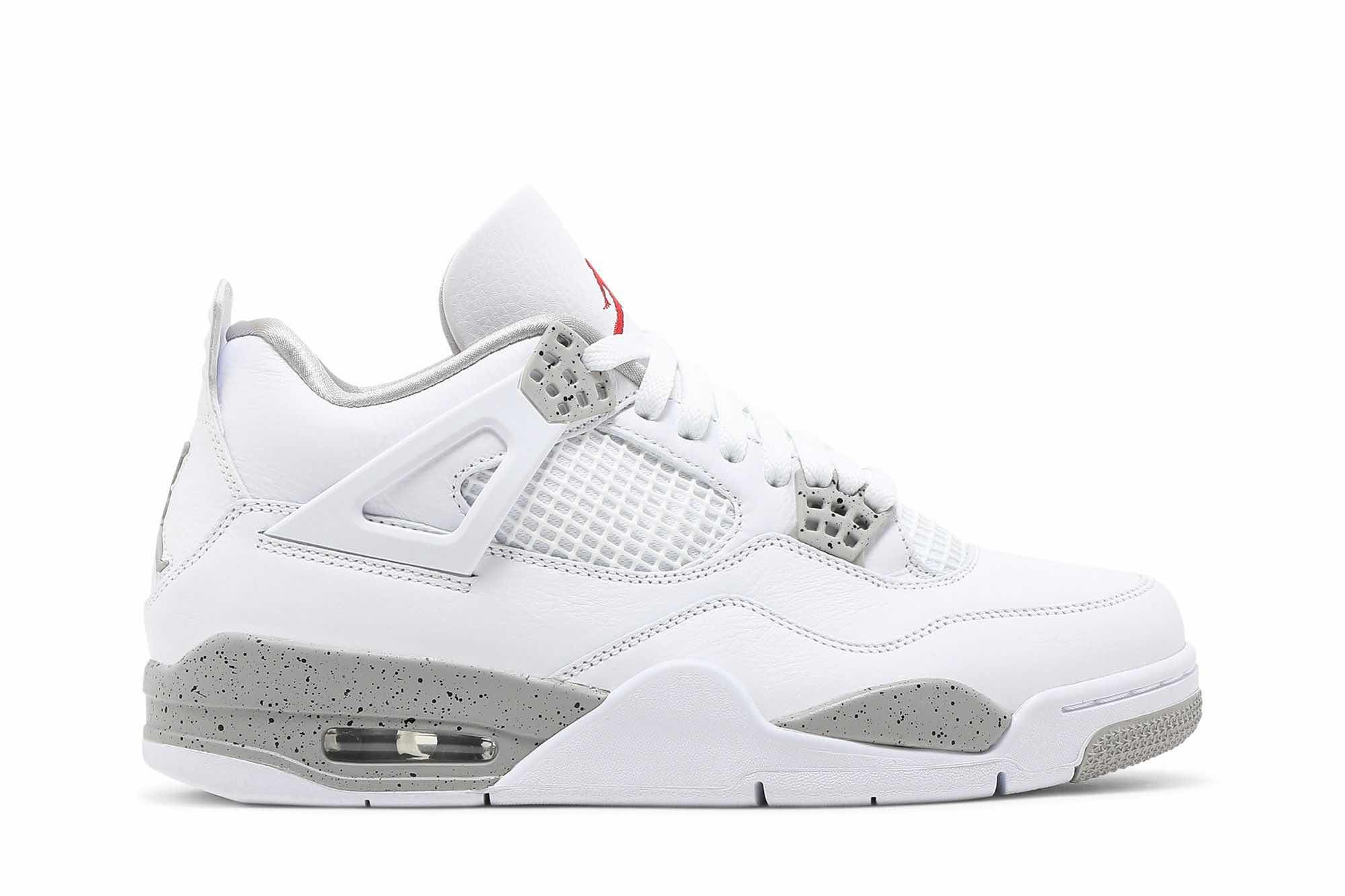 This Air Jordan 4 features an all-White tumbled leather upper detailed with speckled Cement Grey on the plastic eyelets and midsole. Moreover, branding comes in the form of Jumpman logos at the tongue and outsole atop a White rubber sole completes the design. SKU: CT8527-100 Release Date: Jul 3,2021 Color: White/Tech Grey/Black/Fire Red