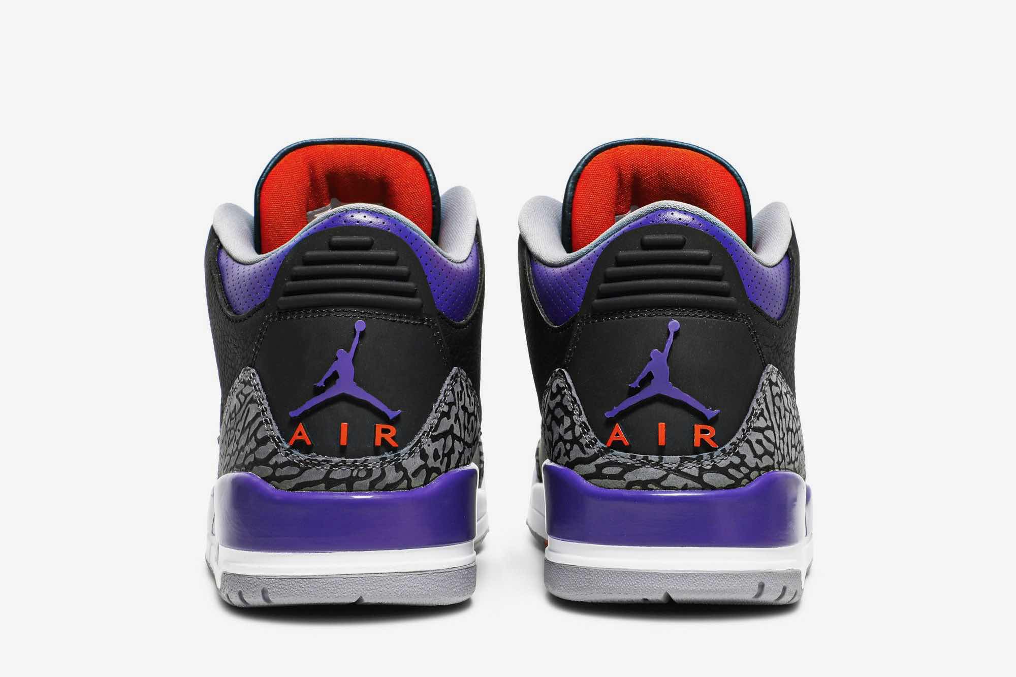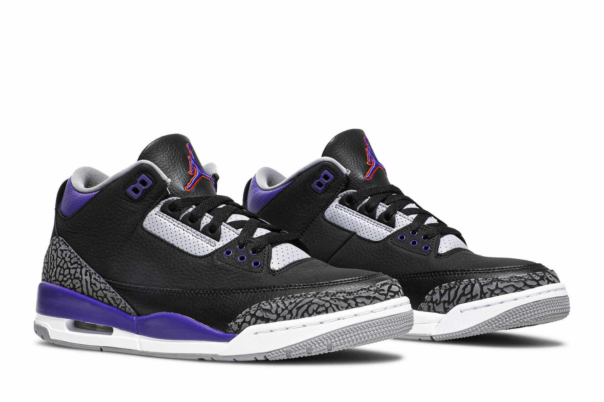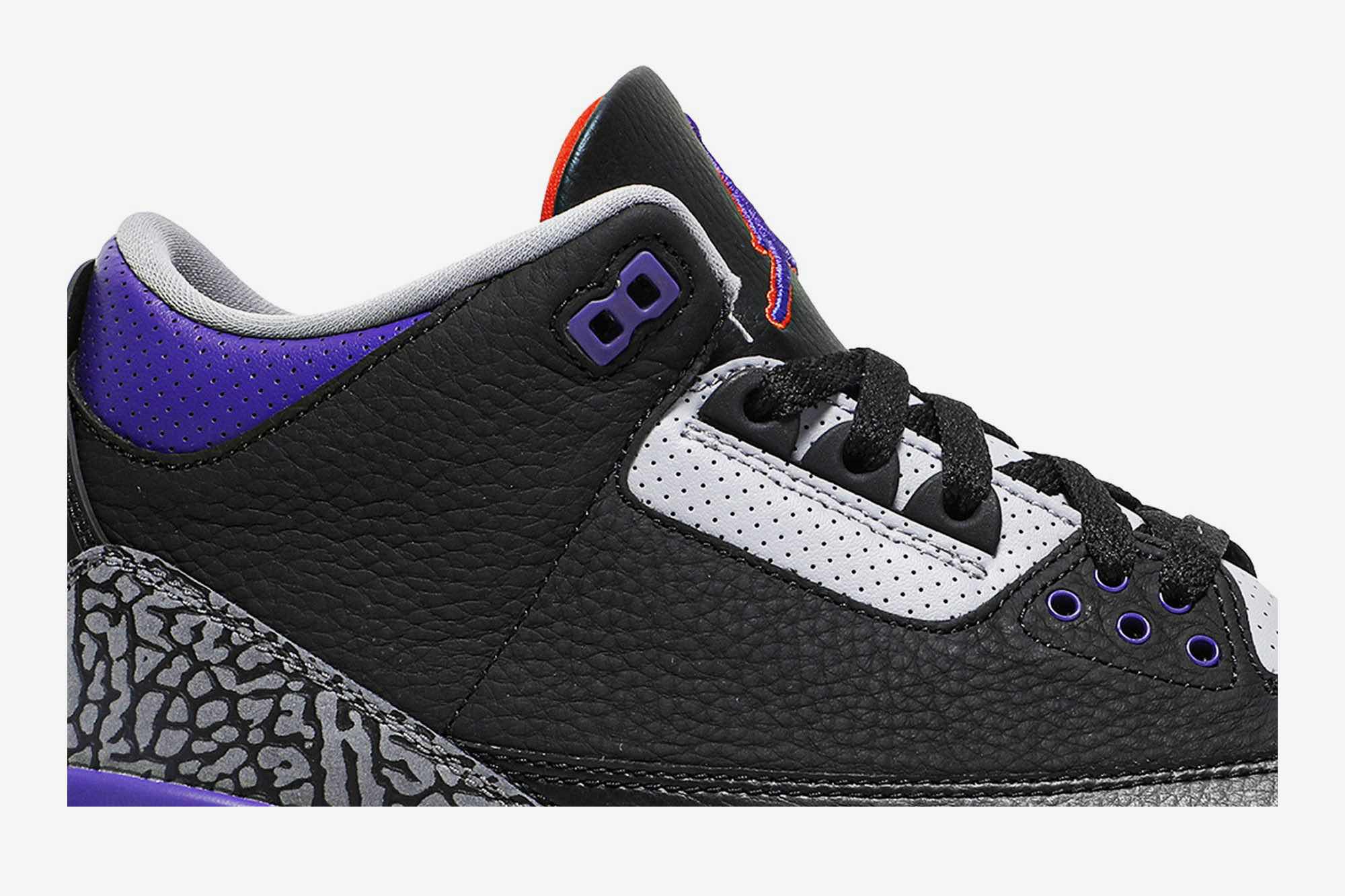 Nike Air Jordan 3 Retro “Black Court Purple” Nike Air Jordan 3 Retro “Black Court Purple” is composed of soft leather exterior, and the entire toe box, silhouette and counter are all dressed in black. The purple enters the midsole from below and is equipped with a perforated collar, eyelets and Jumpman brand.