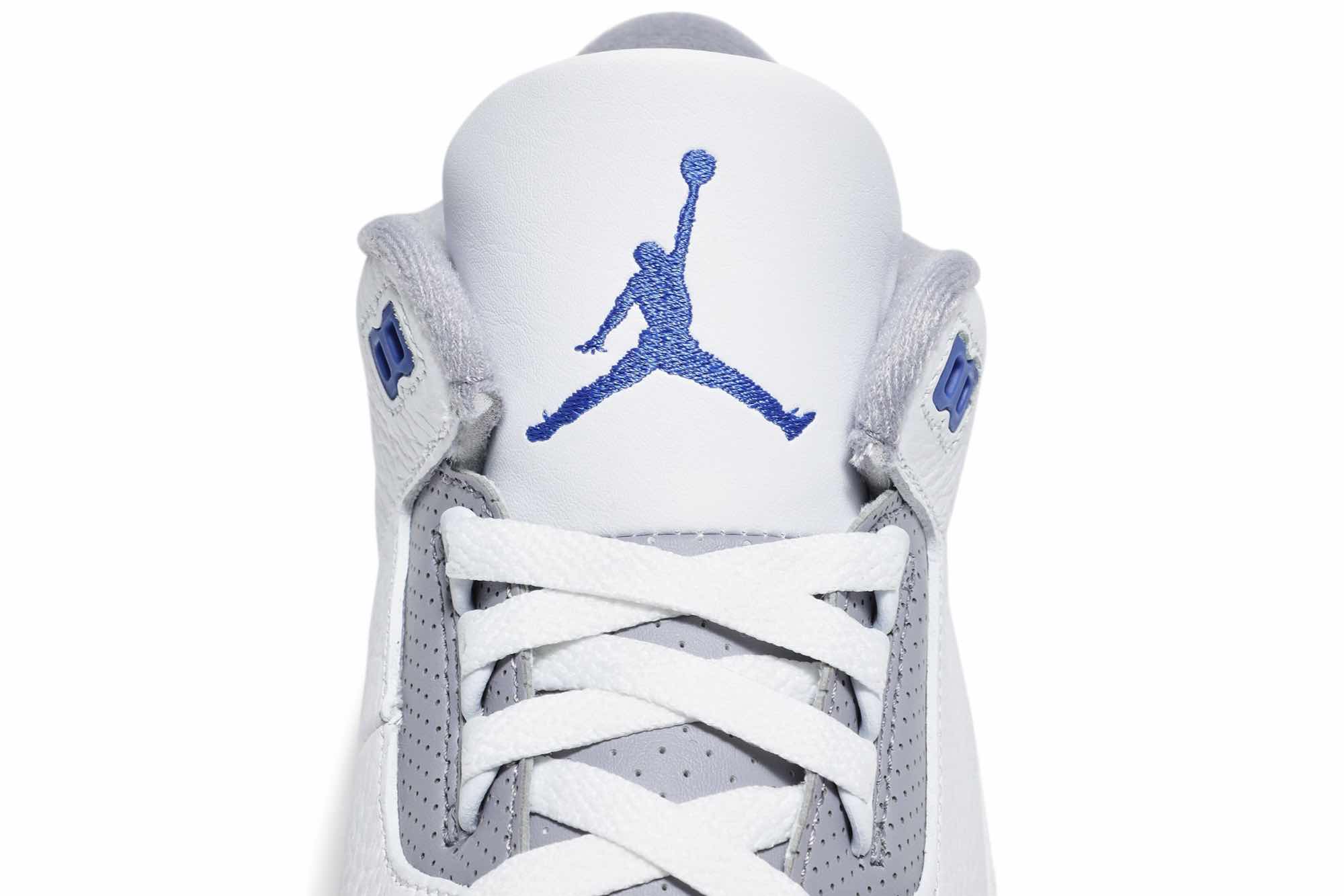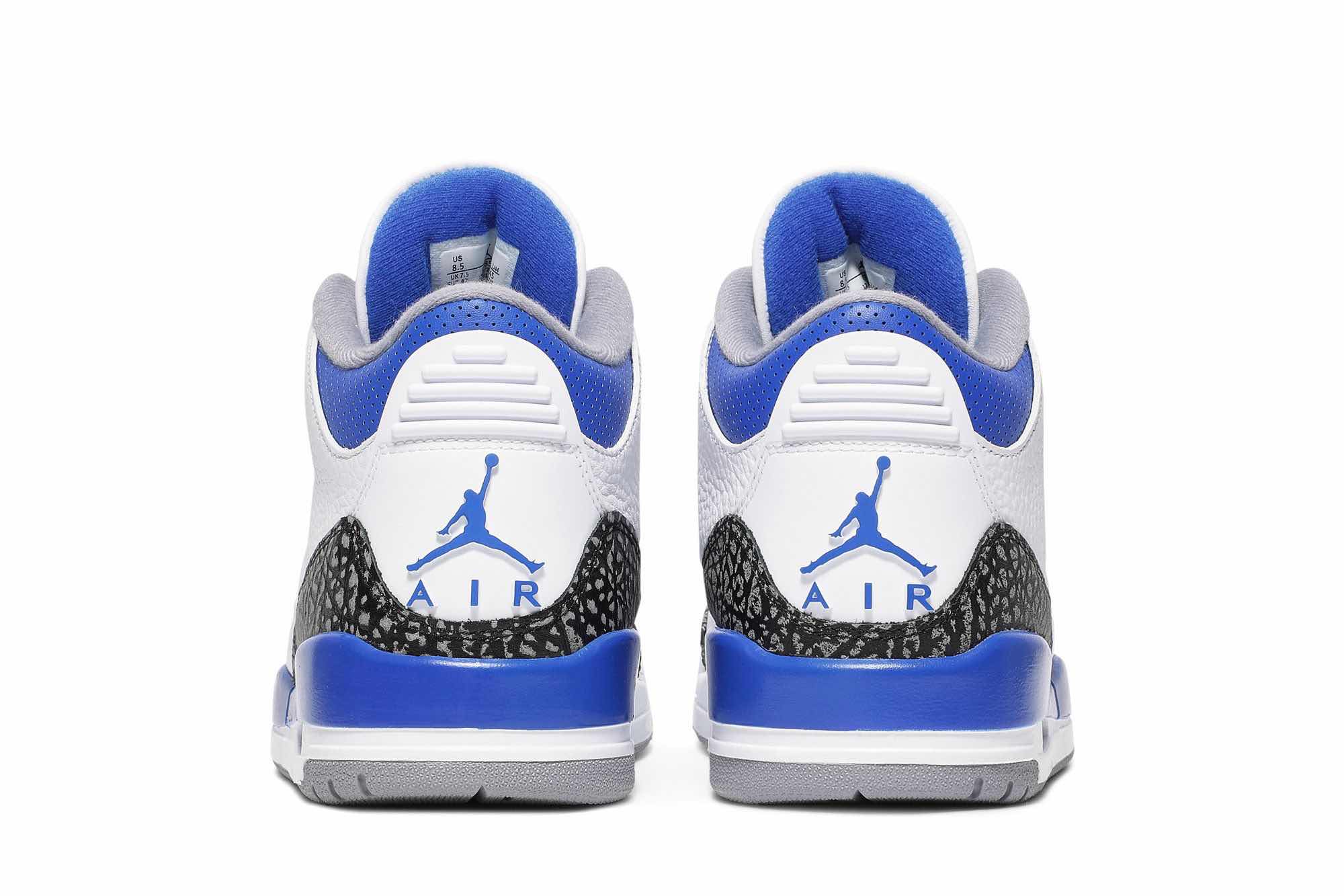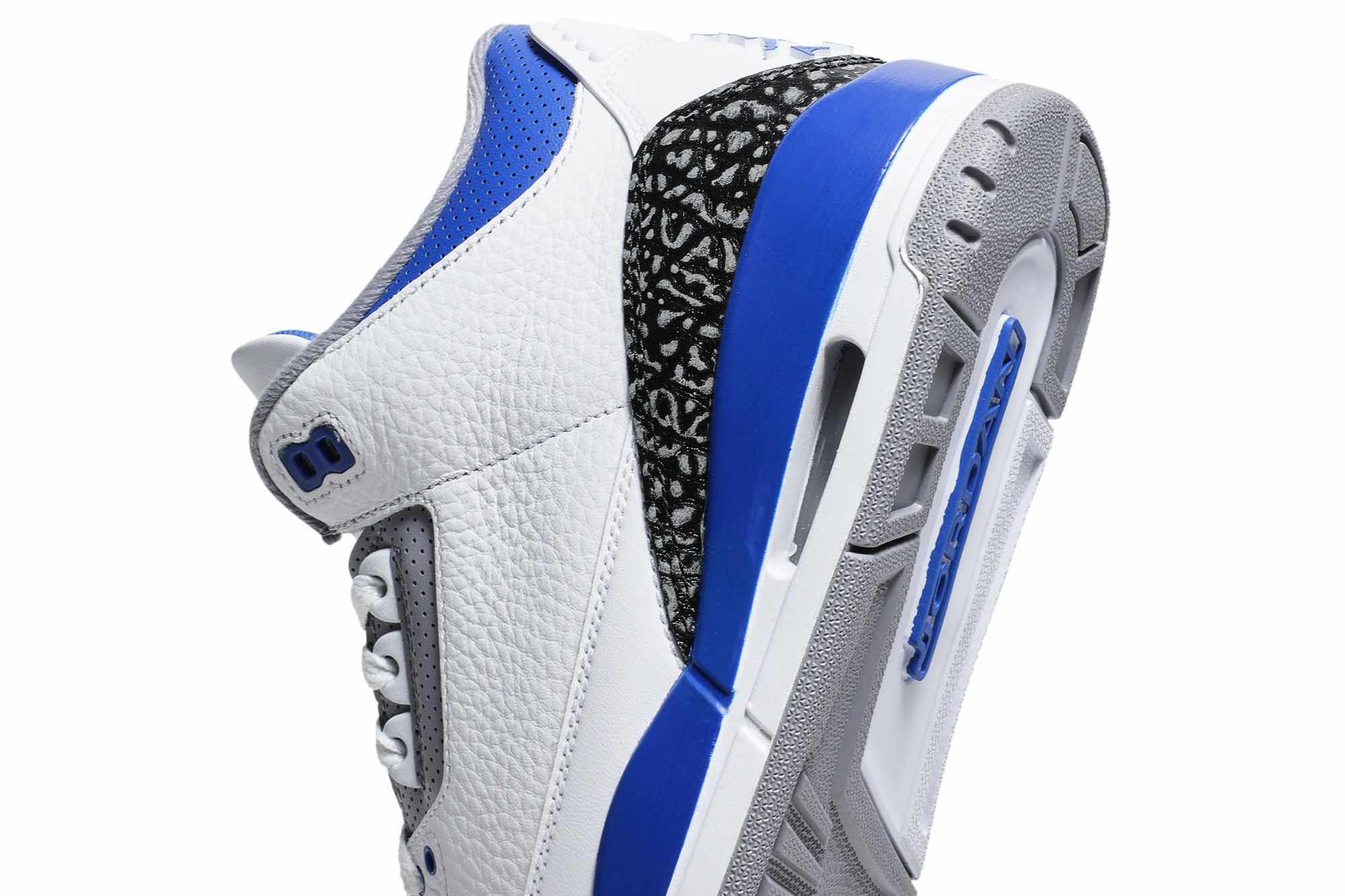 The “Racer Blue” hue stands out overtly over the perforated collars, Jumpman logos on the heel, and tongues counters as well as on the eyelets. This Air Jordan 3 also highlights a white leather base with black 3M reflective elephant print overlays featured with Blue contrasting accents atop a signature Grey rubber outsole.
