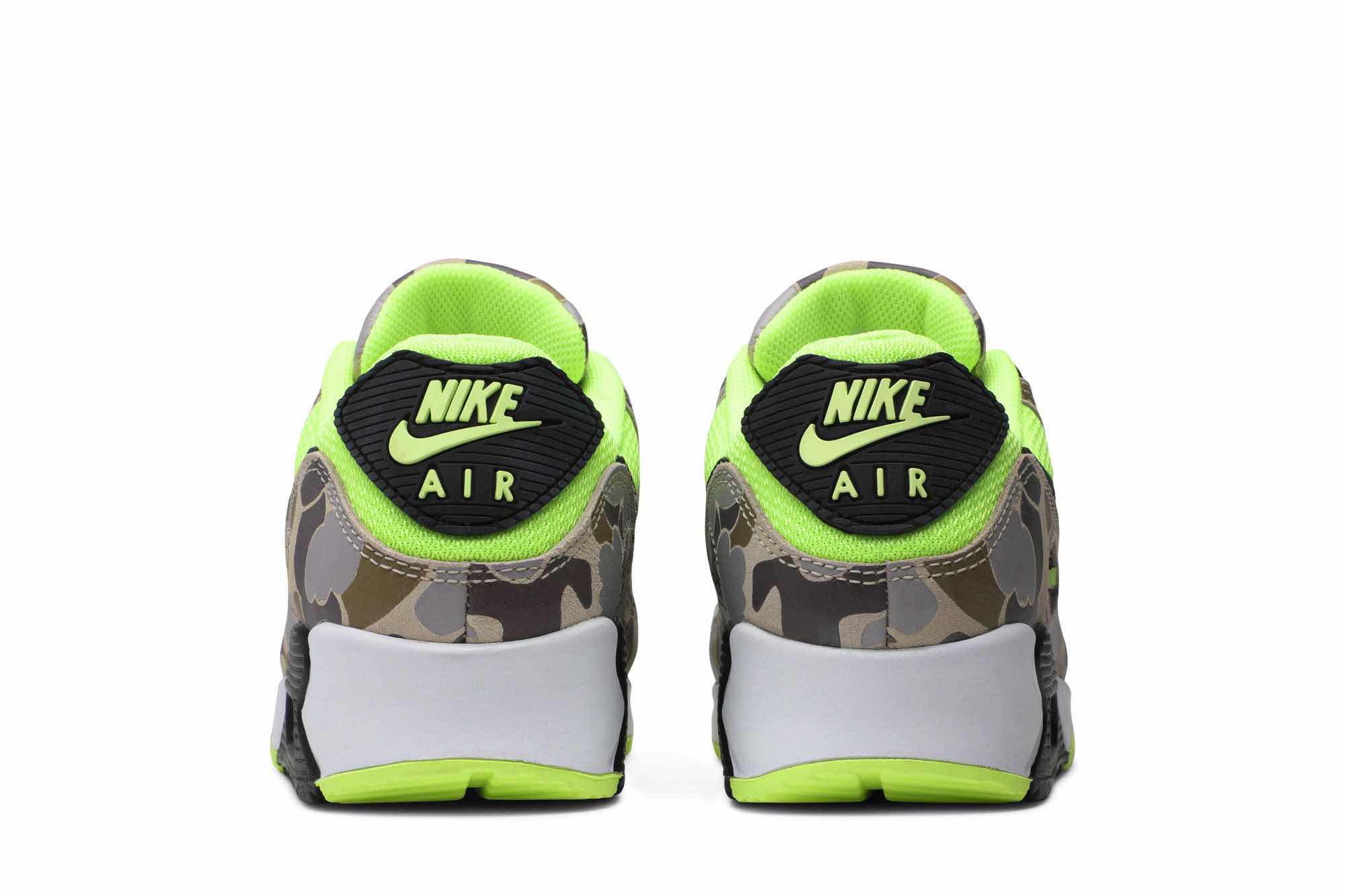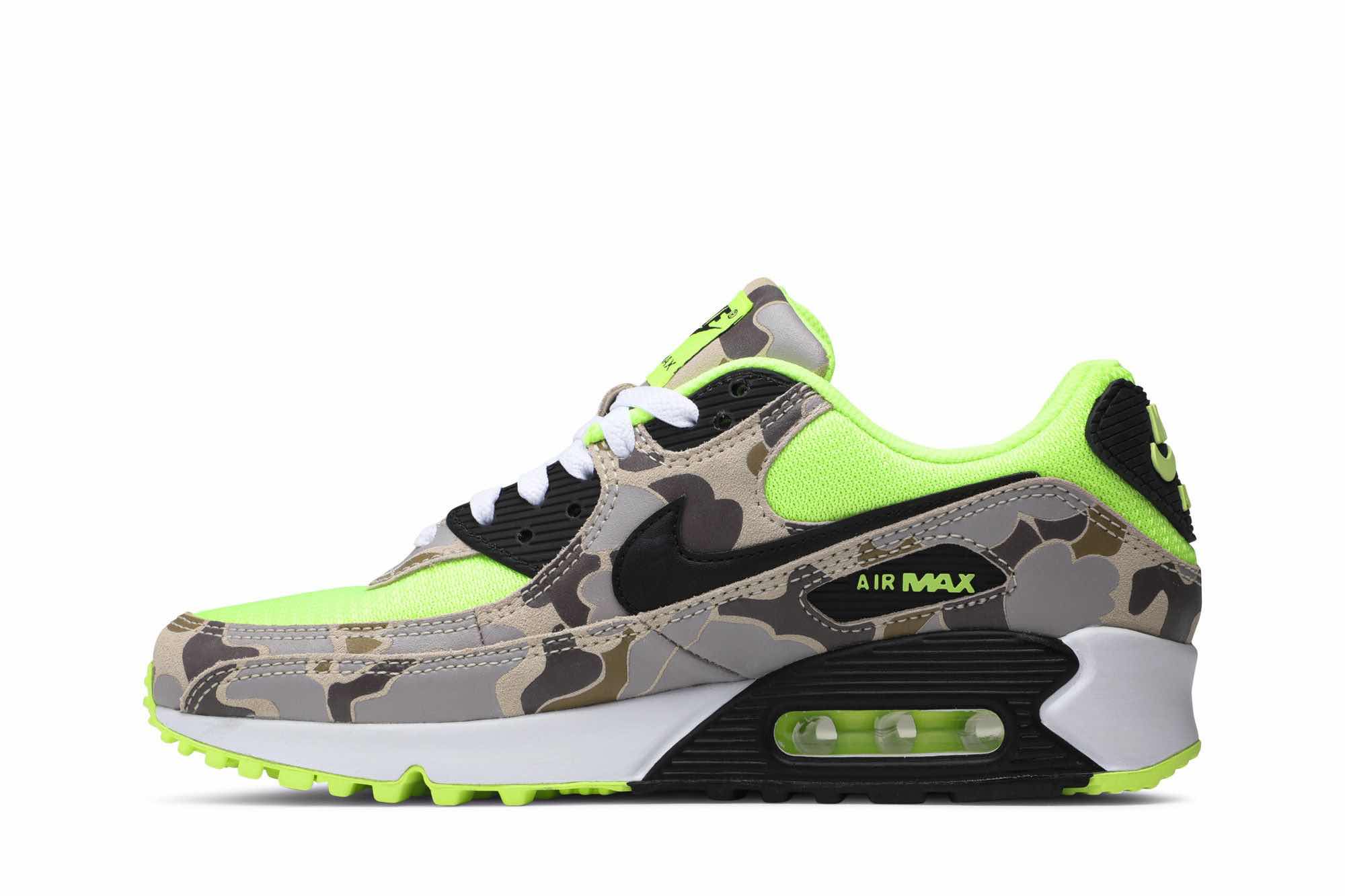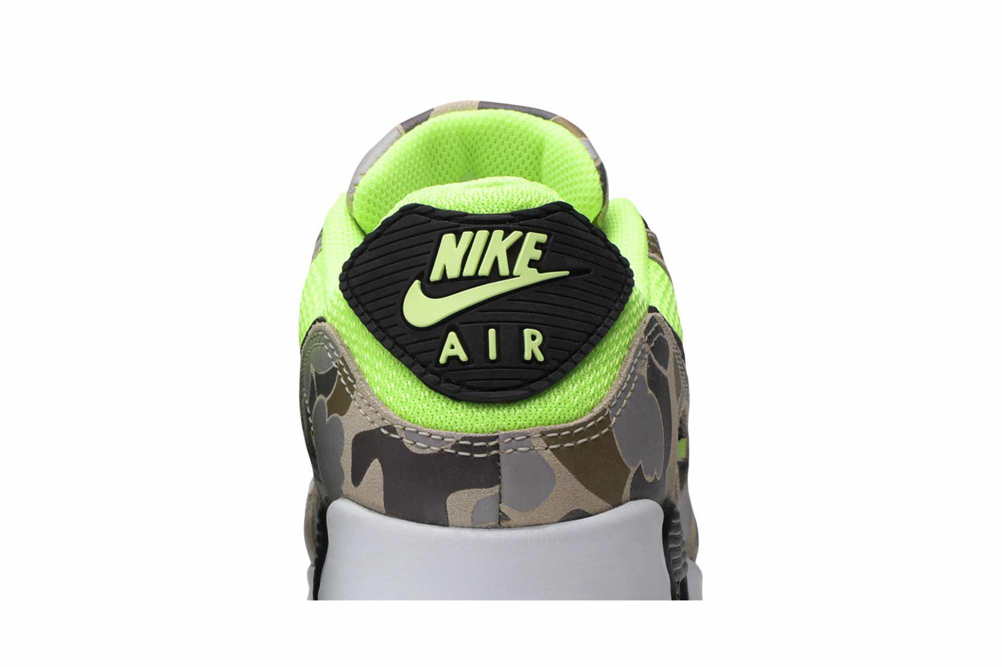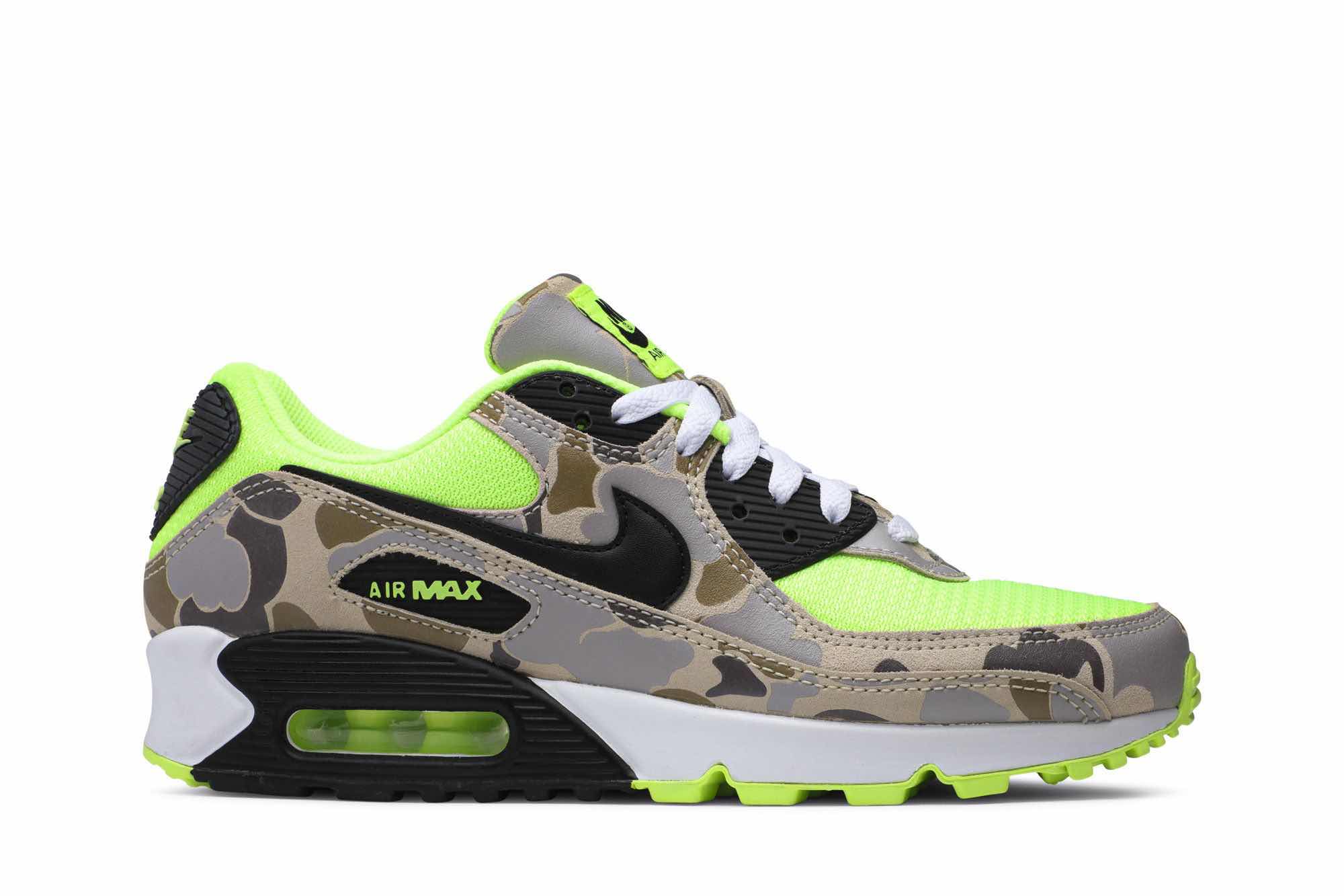 Nike Air Max 90 Green Camo Following on from 2013’s Atmos Duck Camo edition, this Nike Air Max 90 features a volt mesh base with duck camouflage overlays on the mudguard, midfoot, and tongue.