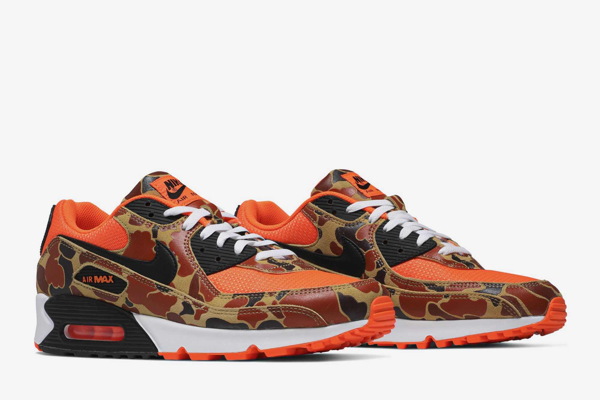 Nike Air Max 90 SP Orange Camo Much like the previous Reverse Duck Camo and Green Camo pairs, this Nike Air Max 90 features a bright orange mesh upper with camouflage printed overlays paired with black leather swooshes on the sides.