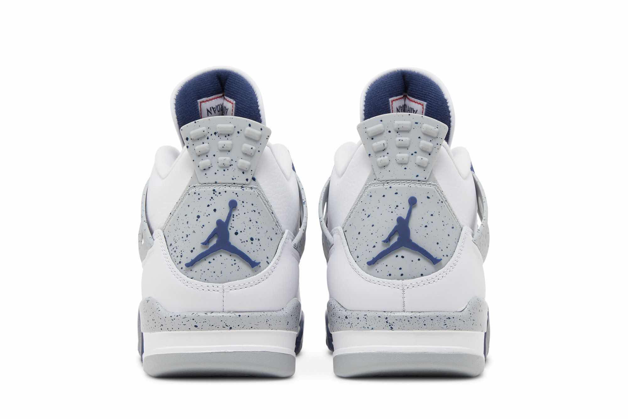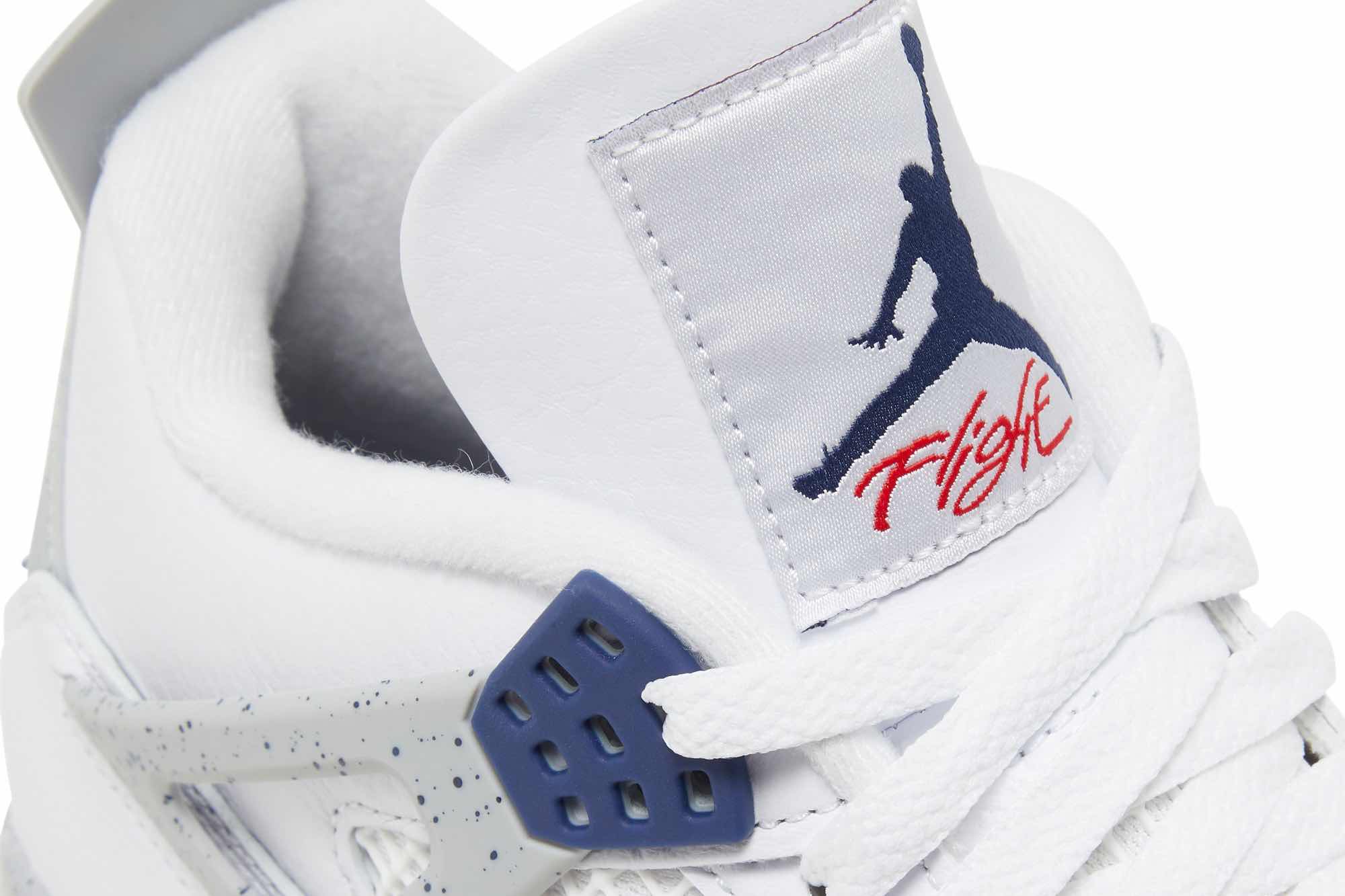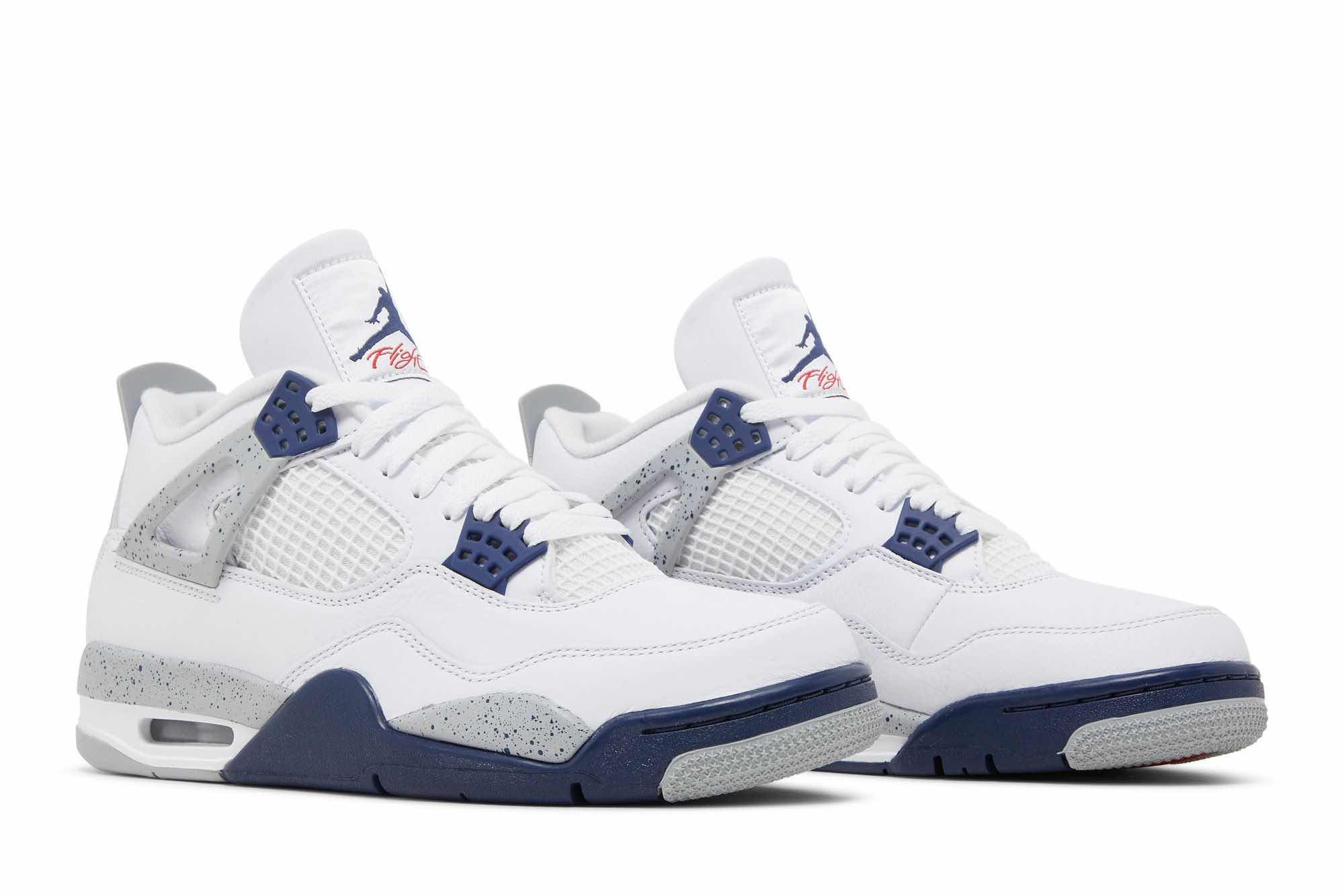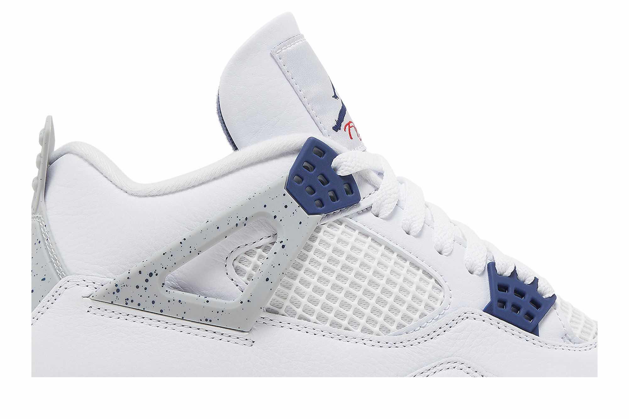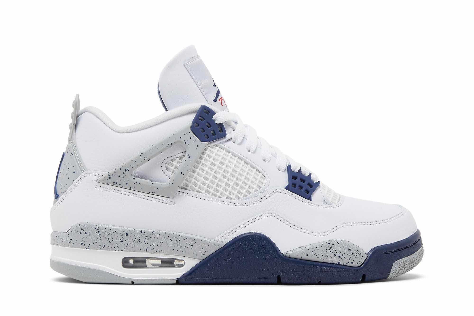 Introducing the Air Jordan 4 Retro White Midnight Navy – the perfect blend of classic and modern. Built for quality and comfort, this timeless sneaker boasts a durable upper constructed from white leather, equipped with black support Wings and Jumpman branding on the heel tab. Woven tongue tags feature an additional Jumpman icon in bright crimson for a fresh update. The cushioning midsole combines two-tone polyurethane with encapsulated Air technology in the forefoot and a visible unit in the heel to give you superior lightweight performance. With its midnight navy elements, light smoke grey detailing, and signature Jumpman styling, this iconic silhouette is sure to kick your collection up a notch. Add timeless style to any outfit with the Air Jordan 4 Retro White Midnight Navy – for a limited time only.