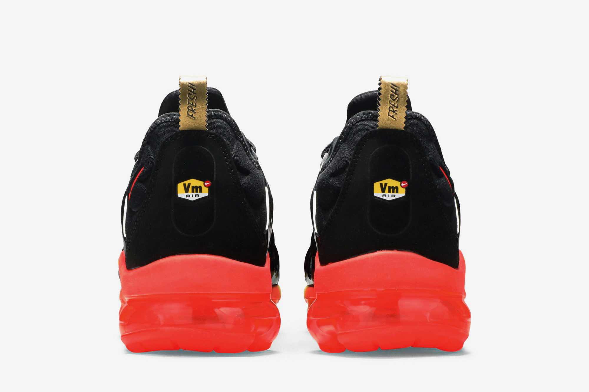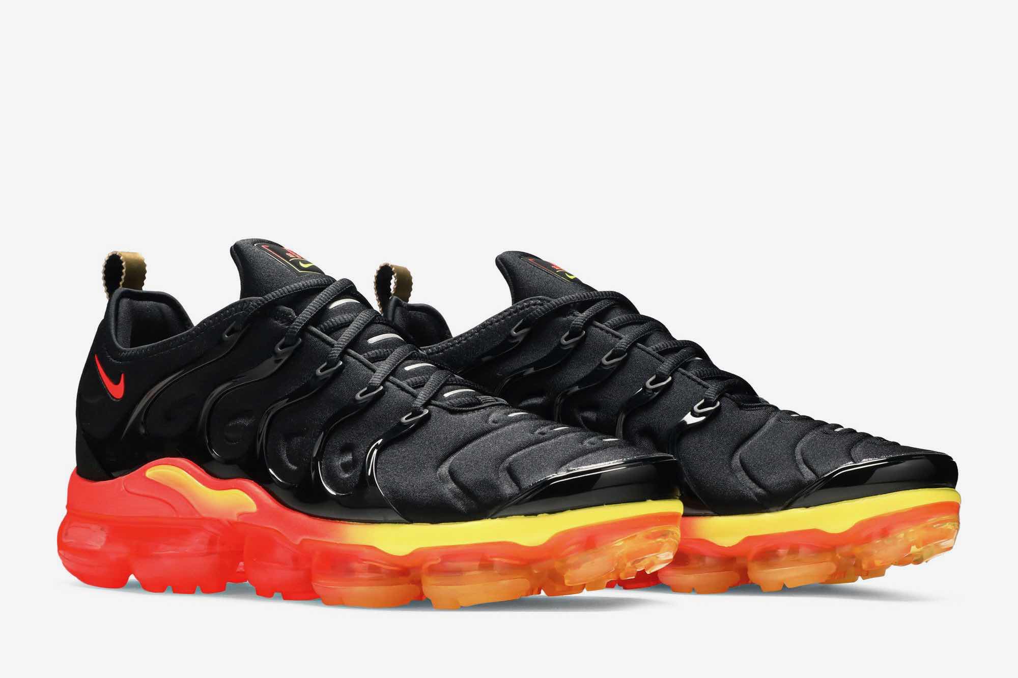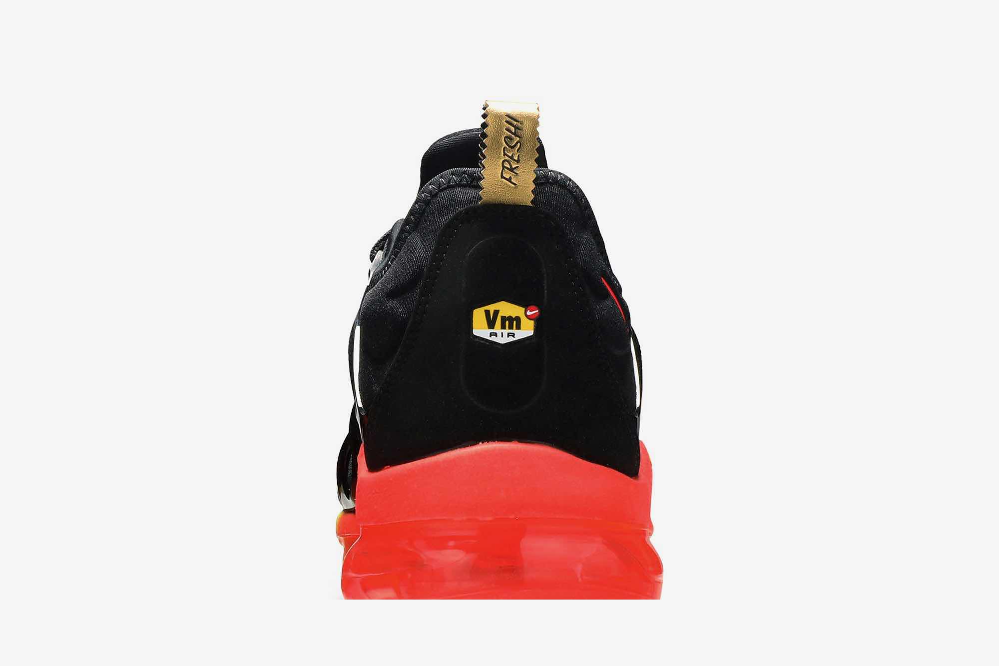 The Nike Air VaporMax Plus Fresh’ uses a fiery combination of colors to highlight the hybrid sneaker’s buoyant tooling. A gradient red and yellow blend is applied to the Air-infused VaporMax platform and foam midsole, the latter equipped with the familiar whale tail-inspired shank from the Air Max Plus. A contrasting solid black finish is used on the upper, featuring a distinctive TPU cage and a red mini-Swoosh for a contrasting pop of color.