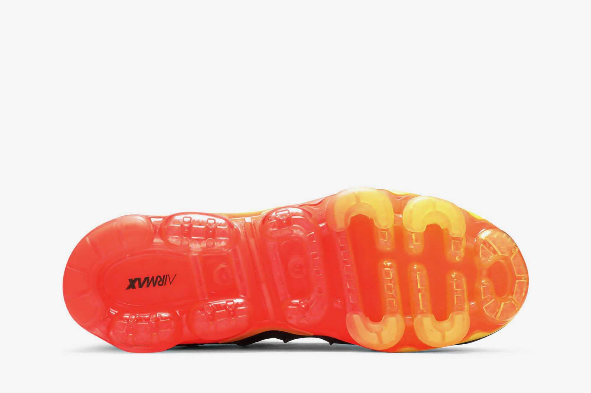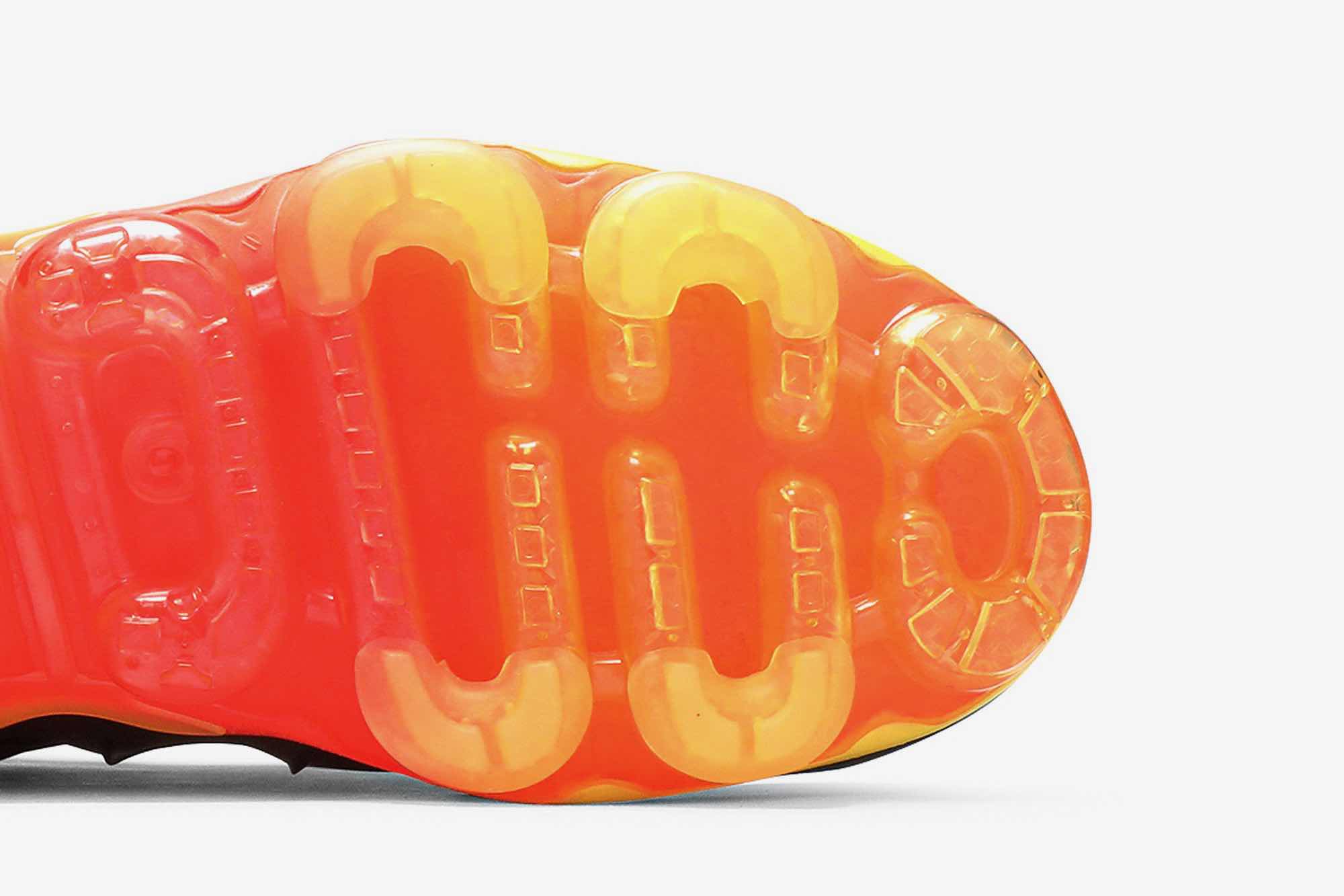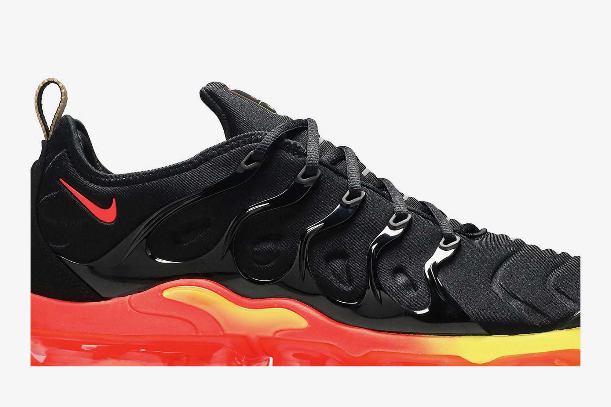 The Nike Air VaporMax Plus Fresh’ uses a fiery combination of colors to highlight the hybrid sneaker’s buoyant tooling. A gradient red and yellow blend is applied to the Air-infused VaporMax platform and foam midsole, the latter equipped with the familiar whale tail-inspired shank from the Air Max Plus. A contrasting solid black finish is used on the upper, featuring a distinctive TPU cage and a red mini-Swoosh for a contrasting pop of color.