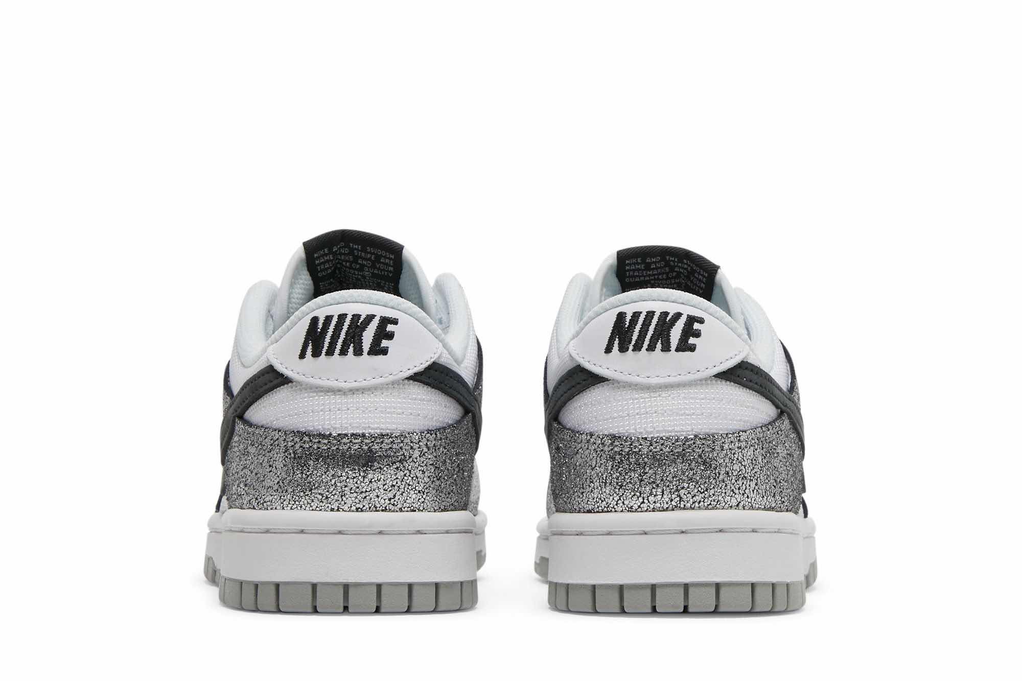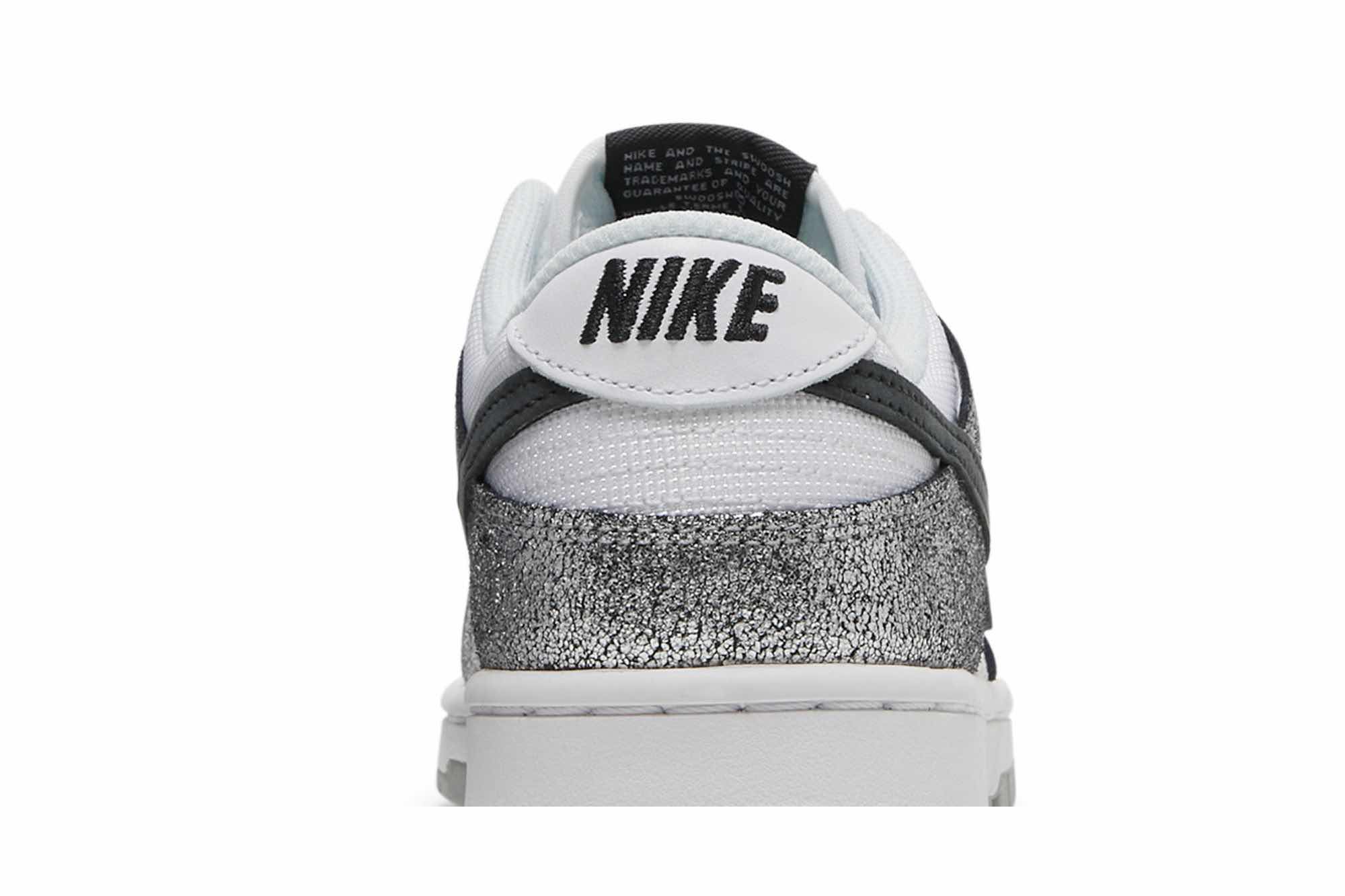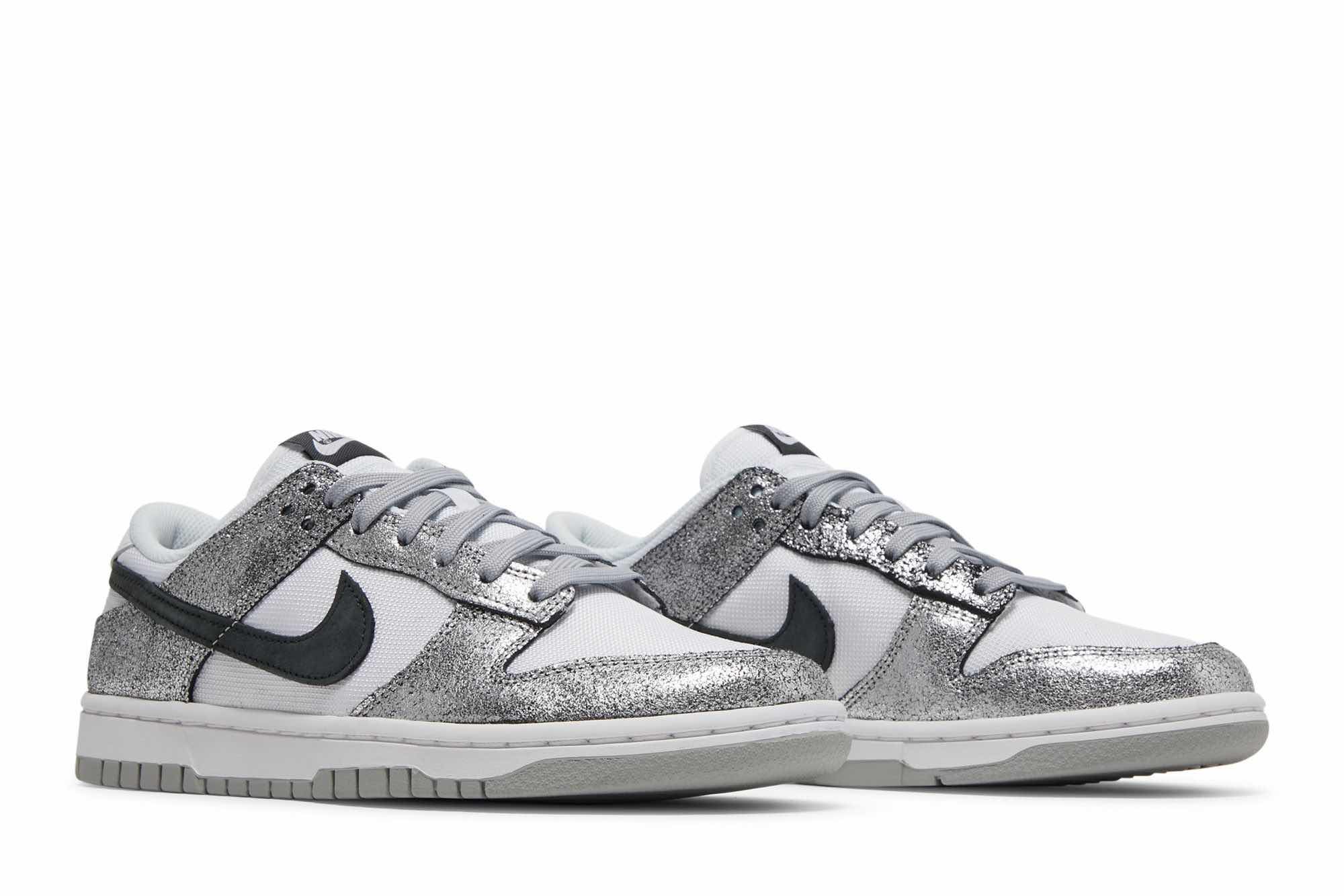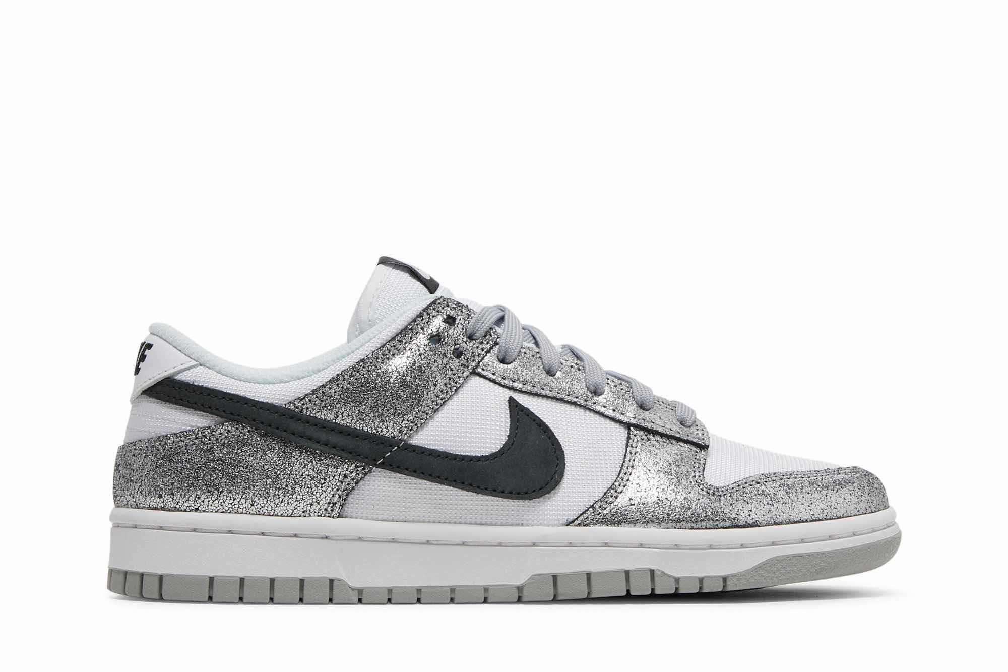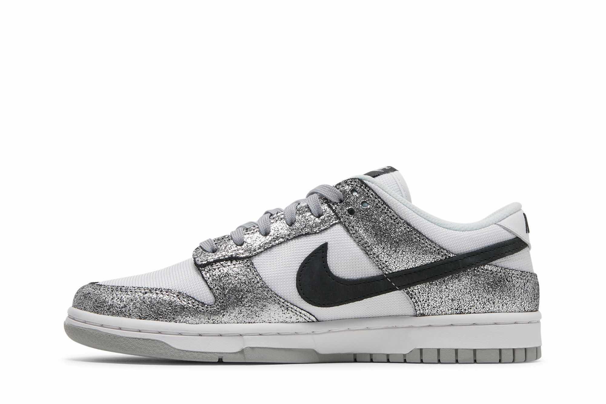 Walk on the wild side with the Nike Women’s WMNS Dunk Low ‘Golden Gals.’ These retro hoops shoes have been given a shimmering makeover that is sure to turn heads. The upper is secured with silver-tone laces and features a white textile base with forefoot and heel overlays in metallic silver-flake leather. Contrasting black accents add a touch of edge, while the Nike wordmark embroidered on the heel tab completes the look. The low-top sits on a standard rubber cupsole and is finished with crisp white sidewalls and a grey rubber outsole. Whether you’re hitting the court or just hitting the town, these shoes are sure to up your style game.